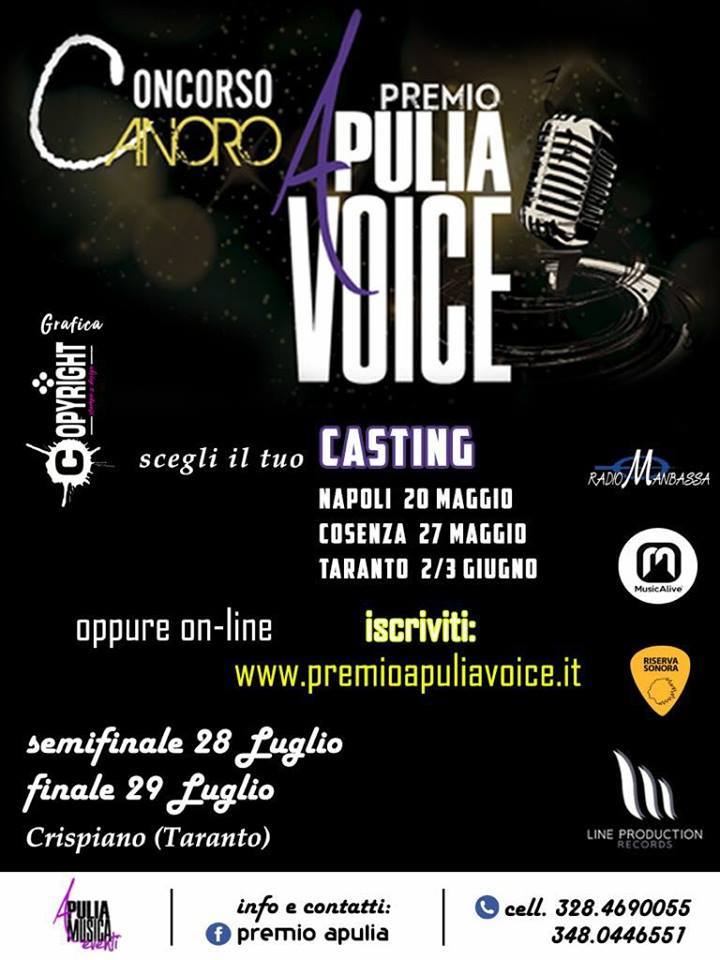 Boom di iscrizioni per le auditions, che si terranno a Napoli il 20 maggio, a Cosenza il 27 maggio e a Taranto il 2 e 3 giugno: sito premioapuliavoice.it in tilt per alcuni giorni per l’ingente numero di richieste di partecipazione.