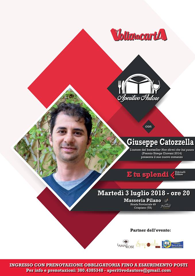 È Giuseppe Catozzella l’ospite del prossimo Aperitivo d’Autore, che si terrà martedì 3 luglio (ore 20) nella splendida Masseria Pilano, a Crispiano. L’autore del caso internazionale “Non dirmi che hai paura”, tradotto in tutto il mondo e vincitore in Italia di 14 premi (tra cui lo Strega Giovani), presenterà il suo nuovo romanzo “E tu splendi” (Feltrinelli Editore), da più di due mesi in classifica. Si tratta di una storia di sconvolgente attualità, che parla di coraggio e del senso di giustizia di un ragazzino che lotta contro il razzismo in un piccolo paesino del Sud Italia.