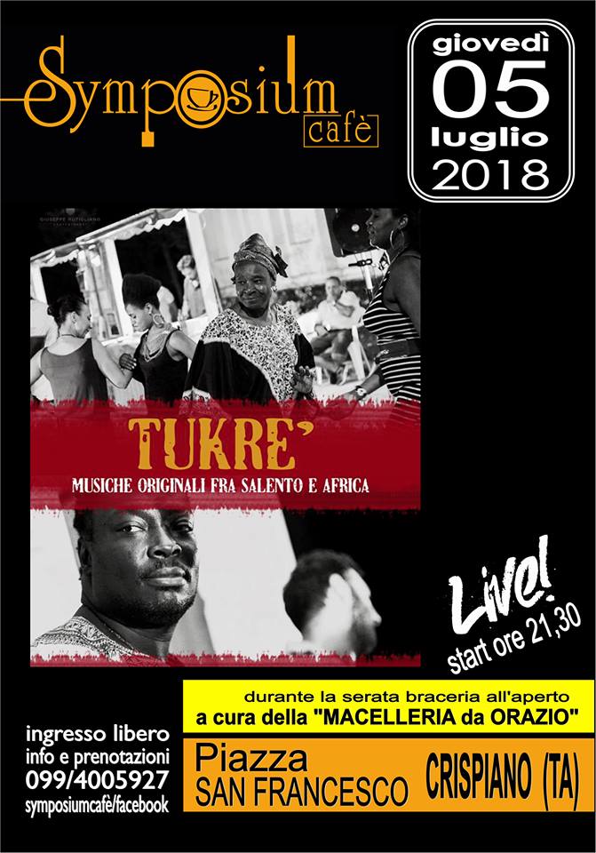 Entra nel vivo a Crispiano la rassegna musicale Scariche Sonore organizzata dall’associazione Symposium Arte. Giovedì 5 luglio in piazza San Francesco avrà luogo il concerto dei Tukrè. Start ore 21.30. Si tratta di un progetto di ricerca e di dialogo musicale fra Salento e Centro Africa che porta sulla stessa scena due musicisti africani (Meissa Ndiaje dal Senegal e Somie Murigu dal Kenia) e cinque musicisti salentini (Claudio Prima, Morris Pellizzari, Emanuele Coluccia, Marco Puzzello e Giuseppe Spedicato) in un repertorio totalmente inedito.