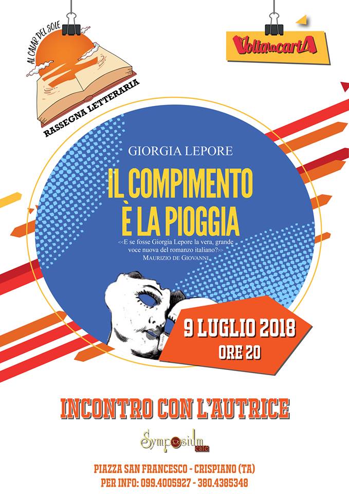 Dopo la falsa partenza della scorsa settimana causa maltempo, gli organizzatori hanno fissato la nuova data del primo appuntamento della mini rassegna letteraria che Volta la carta ha organizzato a Crispiano, in collaborazione con il Symposium cafè. Lunedì 9 luglio la scrittrice Giorgia Lepore presenterà il suo ultimo libro, il noir “Il compimento è la pioggia” (Edizioni E/O) in cui l’ispettore Gerri Esposito è alle prese con un nuovo particolare caso. Dialogherà con lei il giornalista Vincenzo Parabita.