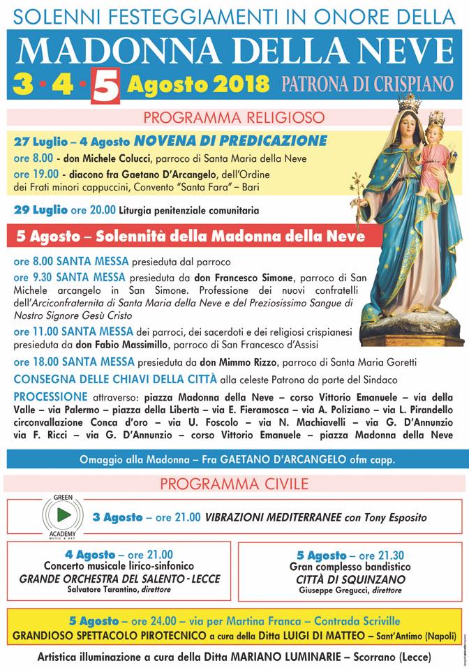 Sono entrati nel vivo a Crispiano i solenni festeggiamenti in onore della Madonna della Neve (3-4-5 agosto), celeste patrona della cittadina jonica, a cura della parrocchia della Chiesa madre retta da don Michele Colucci. La novena in preparazione alla festa (27 luglio – 4 agosto, ore 19) viene predicata dal diacono fra Gaetano D’Arcangelo dei frati minori cappuccini, 29enne crispianese che risiede nel Convento di Santa Fara in Bari. Il programma civile prevede, per la serata del 3 agosto e a cura della Green Academy di Crispiano, lo spettacolo Vibrazioni mediterranee che si avvarrà della presenza del noto percussionista Tony Esposito, storico collaboratore del compianto Pino Daniele, e del cantante e compositore Mario Rosini, secondo classificato al festival di Sanremo 2004. Nella serata del 4 agosto, invece, si esibirà la Grande Orchestra del Salento – Lecce, sotto la direzione del maestro Salvatore Tarantino. Il giorno centrale della festa è il 5 agosto, solennità della Madonna della Neve. La data è quella indicata nel Messale romano come “festa della dedicazione della basilica di Santa Maria maggiore”, il cui titolo latino è Santa Maria ad nives. Il soffitto della chiesa madre di Crispiano riprende architettonicamente, anche se in maniera più modesta, quello della celebre basilica romana. La pia tradizione vuole che sia stata la stessa Vergine Maria a indicare e ispirare la costruzione di una chiesa a lei dedicata sul colle romano dell’Esquilino. Apparendo in sogno contemporaneamente al pontefice Liberio (papa dal 352 al 366) e al patrizio Giovanni, la Madonna chiese la costruzione di un tempio in suo onore, in un luogo che lei stessa avrebbe miracolosamente indicato. E infatti, il mattino del 5 agosto 358 il colle dell’Esquilino apparve inspiegabilmente ammantato di neve. Il Papa tracciò il perimetro della nuova chiesa e il nobile Giovanni provvide alla costruzione dell’edificio, ritenuto il tempio mariano più antico dell’Occidente e da sempre una delle più importanti basiliche di Roma. L’arrivo a Crispiano di questo titolo attribuito alla parrocchia si deve a mons. Giuseppe Antonio de Fulgure, arcivescovo di Taranto dal 1818 al 1833, il quale nel 1826 istituiva la prima parrocchia crispianese denominandola “Santa Maria della Neve”, quando Crispiano era ancora un villaggio dipendente amministrativamente da Taranto (sarebbe divenuto comune autonomo nel 1919). Da allora il popolo di Crispiano, che già onorava la Madonna col semplice titolo di “Santa Maria di Crispiano” (chiesa vecchia presso le grotte del Vallone, sec. XIV), si è messo sotto la protezione di Maria. Subito dopo la Seconda guerra mondiale, la Madonna della Neve venne proclamata protettrice di Crispiano (5.8.1945). La festa richiama ogni anno un gran numero di crispianesi che per vari motivi dimorano lontano dal paese d’origine. Nella mattinata del 5, sante messe: alle ore 8,00 presieduta dal parroco; alle ore 9,30 presieduta da don Francesco Simone, parroco di San Michele arcangelo nella vicina frazione di San Simone; alle ore 11,00 presieduta da don Fabio Massimillo, parroco di San Francesco d’Assisi. Alle ore 18,00 santa messa presieduta da don Mimmo Rizzo, parroco di Santa Maria Goretti. Subito dopo, in piazza Madonna della Neve, la tradizionale consegna delle chiavi della città alla celeste patrona da parte del nuovo sindaco Luca Lopomo, cerimonia molto attesa e sempre ricca di suggestione che precede la tradizionale, partecipatissima processione dell’immagine della Madonna della Neve per le vie del paese, protagoniste anch’esse con i loro abitanti di un vero e proprio tripudio di gioia al passaggio della Madonna, che col suo sguardo benedicente saluta ammalati e persone altrimenti impossibilitate a uscire di casa. Al rientro della processione, tutta la popolazione si unisce nella preghiera intonando l’inno alla Madonna della Neve, composto da mons. Giuseppe Maria Caforio (1878-1965), per oltre mezzo secolo arciprete di Crispiano. Il tradizionale omaggio a Maria al termine della processione è affidato a fra Gaetano D’Arcangelo. Subito dopo, l’esibizione del Gran complesso bandistico “Città di Squinzano” diretto dal maestro Giuseppe Gregucci. A mezzanotte, spettacolo pirotecnico sulla via per Martina Franca, contrada Scriville.