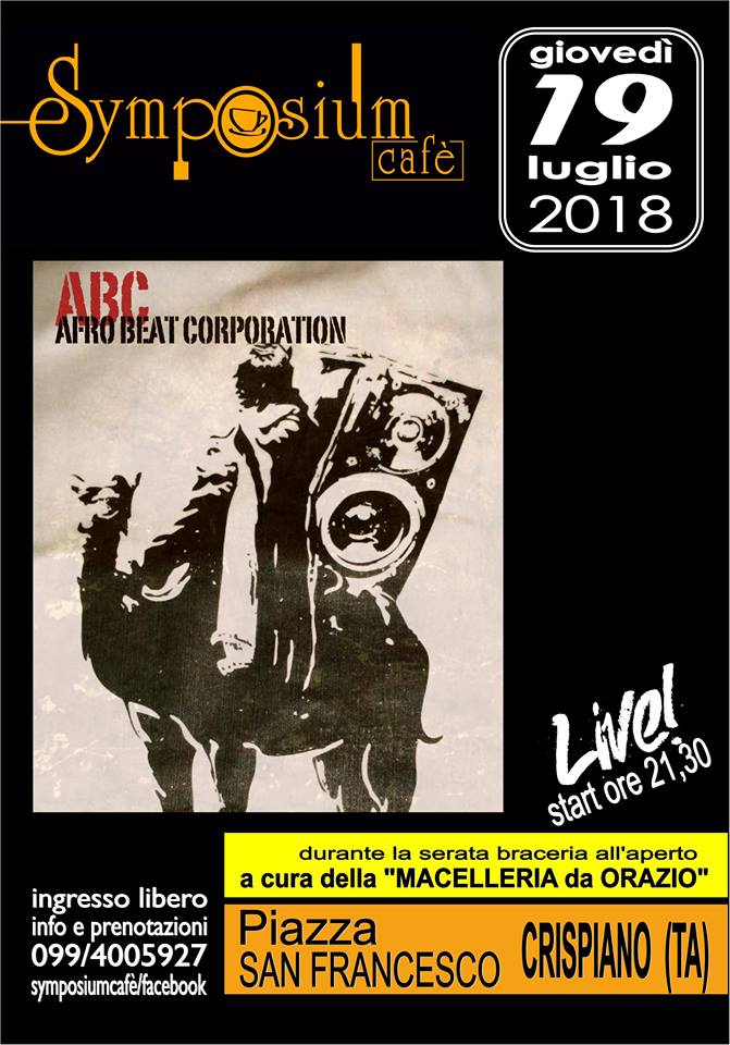 Dopo il trionfo di colori del Crispiano Comix, in piazza San Francesco torna il consueto appuntamento settimanale con la musica. Giovedì 19 luglio, per la rassegna musicale Scariche Sonore, è la volta degli ABC – Afro Beat Corporation. La formazione, nata nel 2013, mescola all’afrobeat tipico degli anni ’70 sonorità jazz, funk, dub, reggae, immergendo il tutto in un atmosfera più moderna grazie all’utilizzo di effetti elettronici e samples.