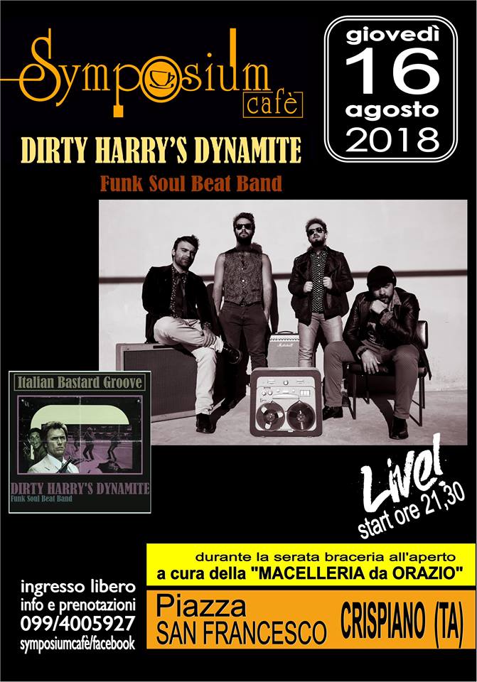 Non si ferma neppure la settimana di Ferragosto la rassegna musicale Scariche Sonore al Symposium Cafè. Giovedì 16 agosto arrivano a Crispiano i Dirty Harry’s Dynamite, la band barese che propone un singolare repertorio di colonne sonore di film sia inedite che dei grandi maestri del genere. Chitarre acide, bassi martellanti, organi psichedelici, batterie incendiate e un registratore a nastro caratterizzano l’accattivante sound della band. Il live è gratuito e avrà inizio alle 22. Per info e prenotazioni tavoli: 099.4005927. Oltre ai panini, ai piatti unici, alla stuzzicheria, alle birre, ai gelati e a tanto altro che il Symposium Cafè propone, ci sarà la possibilità di degustare le specialità gastronomiche di carne alla brace della macelleria da Orazio.