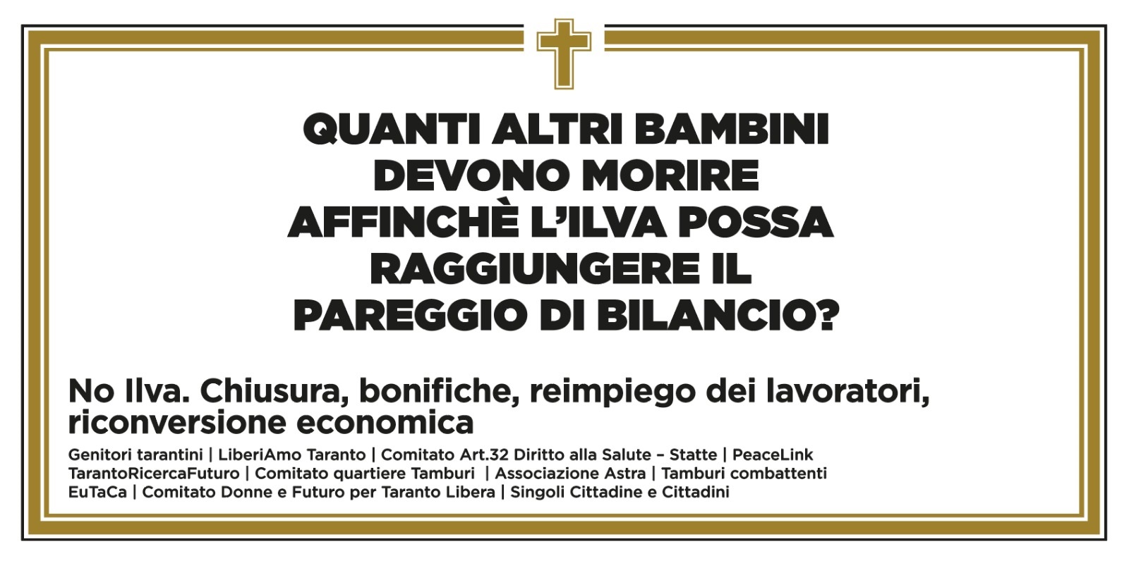 sul manifesto di sei metri per tre (che inviamo in allegato), affisso al quartiere Tamburi di Taranto, spicca la più infame tra le ingiustizie che la provincia tarantina è costretta a subire da troppi decenni in numero francamente insopportabile.