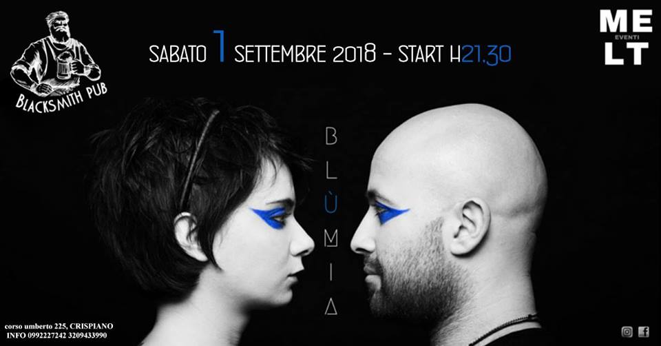 Arriva settembre e continua l’estate di musica inedita al Blacksmith Pub. Sabato 1 settembre sul palco del locale crispianese saliranno i Blùmia, il duo salentino che mescola la musica elettronica con quella alternative, soul, rock e dub. Il live inizierà alle 22 e si terrà all’aperto, nell’ampio giardino del Blacksmith (corso Umberto I, 225). Per info e prenotazioni tavoli è possibile telefonare ai seguenti numeri: 099.2227242 – 320.9433990.