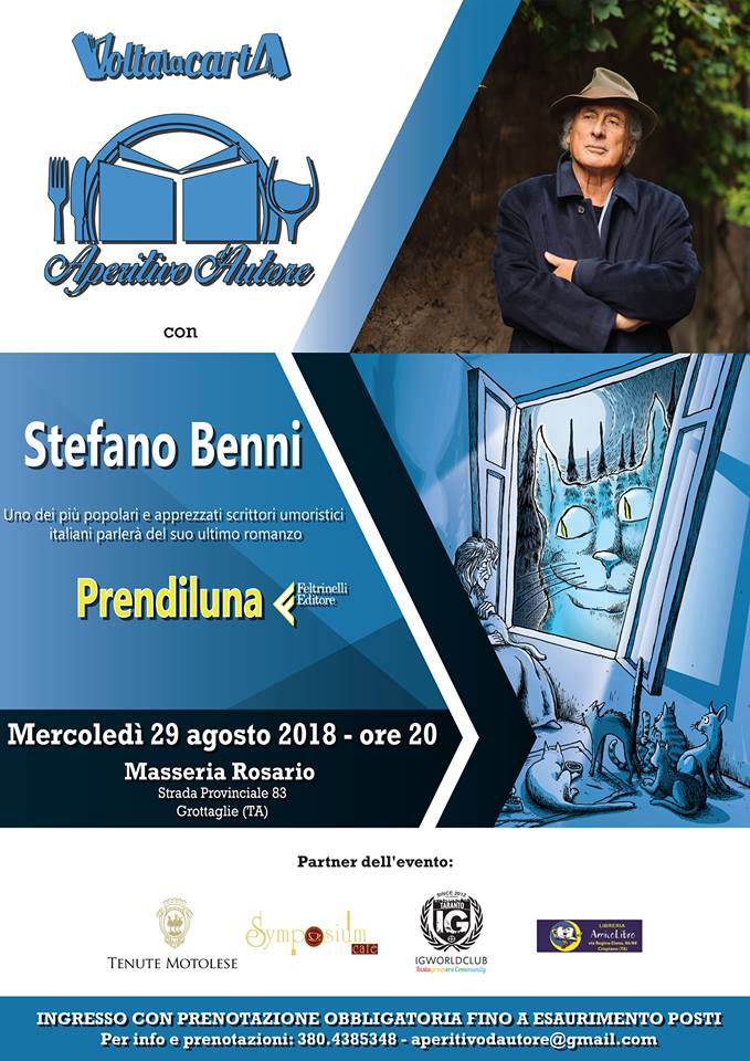 Per prendere parte all’evento è obbligatorio prenotare chiamando al numero 380.4385348 oppure scrivendo all’indirizzo email aperitivodautore@gmail.com. I partecipanti godranno di un ricercato aperitivo realizzato anche stavolta dal Symposium Cafè e degusteranno gli eccellenti vini di Tenute Motolese. Sono partner dell’iniziativa anche la community Ig Taranto e la libreria AmicoLibro.