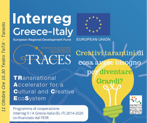 h. 16,30: presentazione del progetto “TRACES – TRansnational Accelerator for a Cultural and Creative EcoSystem” e dei dati sullo stato delle imprese culturali e creative nella provincia di Taranto