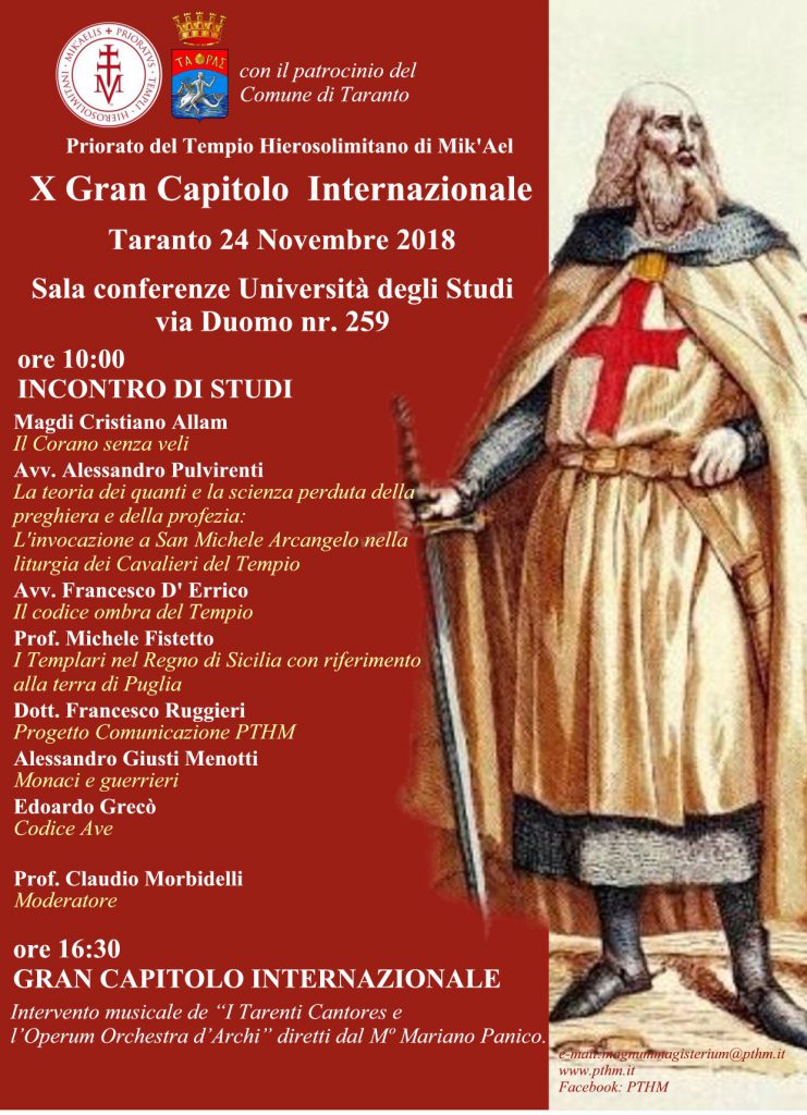 Sabato 24 novembre 2018 con inizio alle ore 10:00, nella sala convegni (ex chiesetta) della Università degli studi, in città vecchia a Taranto, si terrà un convegno di studi dal tema: “Cavalieri Templari: uomini e donne moderni dai valori antichi”