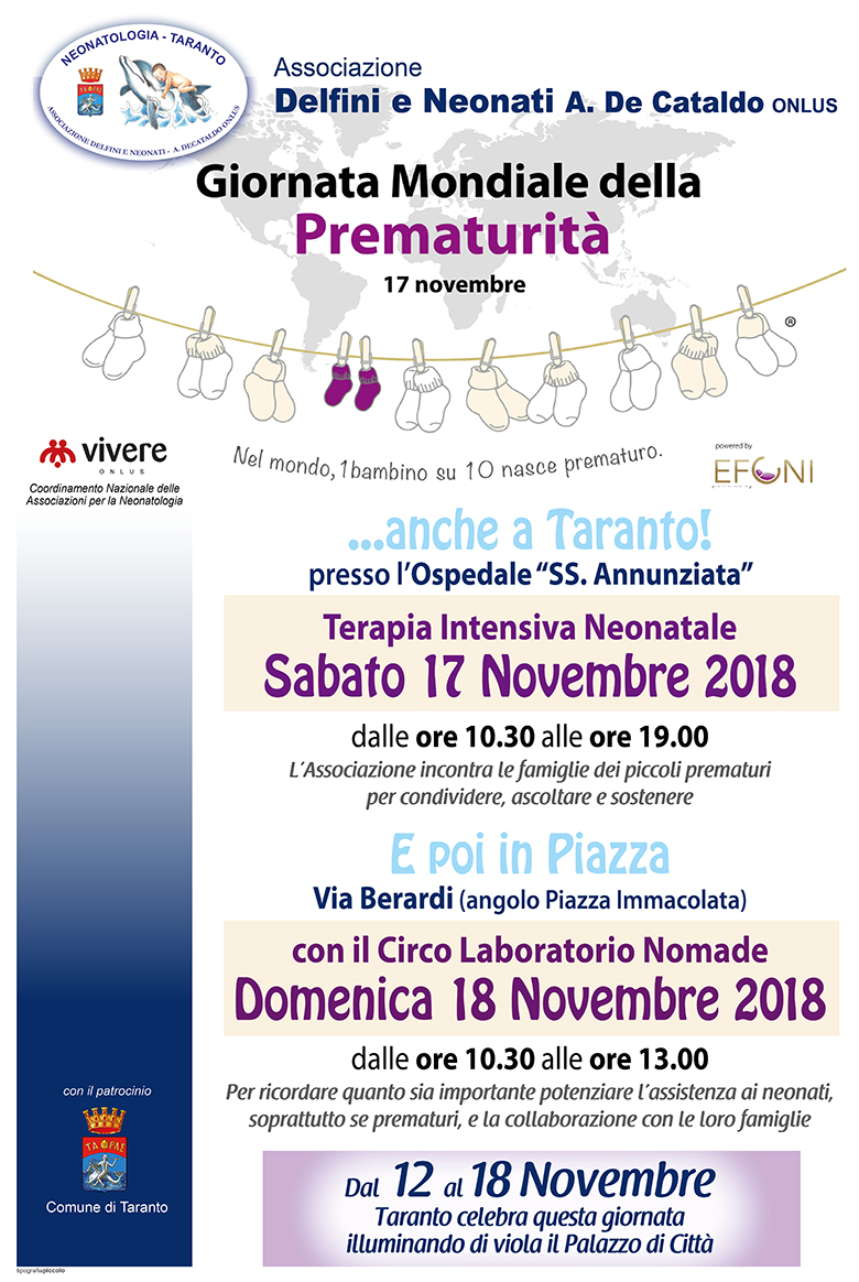 Oltre che ad illuminare Palazzo di Città, grazie alla sensibile disponibilità del Comune di Taranto che ha patrocinato l’evento, l’Associazione, il 17 novembre sarà presente nel reparto di Terapia Intensiva Neonatale, diretto dal dott. Oronzo Forleo,  per incontrare le famiglie premature ricoverate.