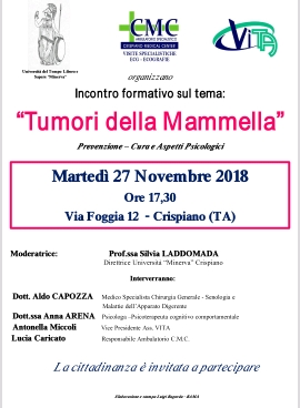 Interverranno il dott. Aldo Capozza, Medico specialista Chirurgia Generale – Senologia e Malattie dell’Apparato digerente; la dott.ssa Anna Arena, Psicologa, Psicoterapeuta cognitivo comportamentale; Antonella Miccoli, vice Presidente Associazione “Vita” e Lucia Caricato, Responsabile Ambulatorio C.M.C (Crispiano Medical Center). L’incontro, al quale la cittadinanza è invitata a partecipare, si terrà martedì prossimo, 27 novembre, alle ore 17,30, in Via Foggia n. 12. Moderatrice della serata, la prof.ssa Silvia Laddomada, direttrice dell’Università “Minerva”.