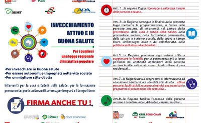 Domenica 11 novembre 2018 il Sindacato Pensionati della CGIL sarà in via della Resistenza dalle 9,30 alle 12,30 per raccogliere le firme a sostegno di una legge regionale di iniziativa popolare per “L’INVECCHIAMENTO ATTIVO E IN BUONA SALUTE”. Le persone con età superiore a 65 anni in Puglia rappresentano…