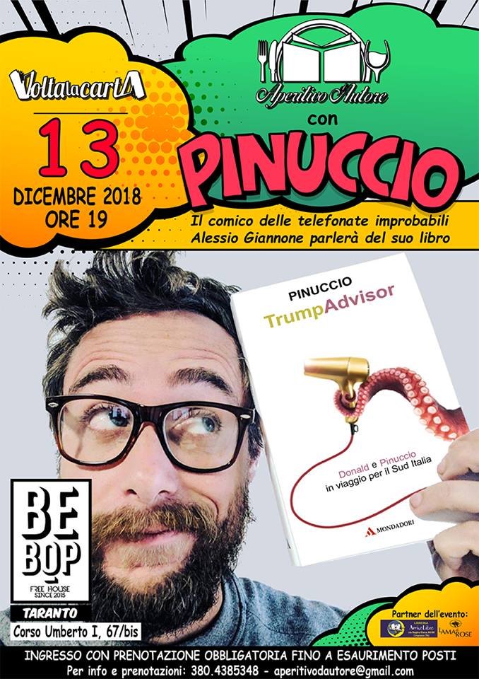 Diventato celebre sul web per le sue esilaranti telefonate e attualmente inviato di Striscia la Notizia, Pinuccio (alter ego di Alessio Giannone) sarà ospite di Aperitivo d’Autore per presentare il suo primo libro, “TrumpAdvisor: Donald e Pinuccio in viaggio per il Sud Italia” (Mondadori Libri), in cui attraverso la satira racconta un surreale viaggio in Puglia con l’amico Sabino. L’appuntamento è per giovedì 13 dicembre al Bebop di Taranto.