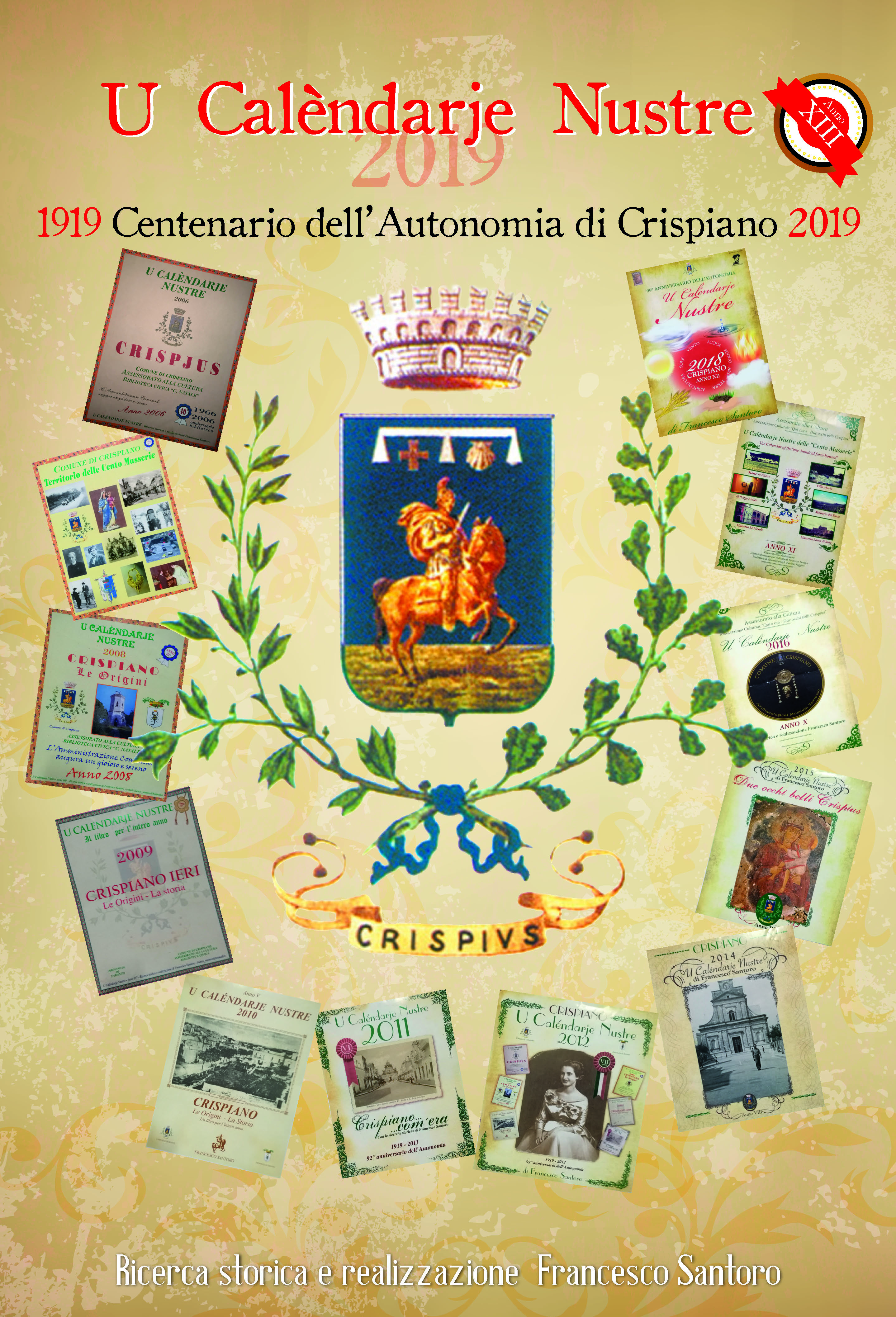 L’Associazione Culturale “Qui e Ora Due Occhi Belli Crispius” con il patrocinio del Comune di Crispiano e, in occasione del Centenario dell’Autonomia Comunale ottenuta nel 1919, ha realizzato la tredicesima edizione de U “Calèndarje Nustre 2019”. Quest’anno, il calendario sarà pubblicato in tre diverse configurazioni con proverbi e modi di dire in dialetto Crispianese. Inoltre, sarà evidenziato il < Proverbio del mese> mettendo in risalto quello che i nostri avi riassumevano un intero discorso con una singola frase e la sua relativa metafora. L’opera culturale si fregia di annoverare per ogni giorno dell’anno un   particolare proverbio, unitamente ai modi di dire tradizionali della civiltà contadina, pertanto, sono riportati alcuni soprannomi che identificavano i crispianesi di ieri. Un’altra particolarità del calendario sono le dodici foto antichissime di come era Crispiano ai primi del secolo scorso, mentre nella seconda pagina di copertina, sono menzionati tutti i Sindaci succedutesi dal 1920 al 2018 e, l’elenco nominativo delle Cento Masserie.