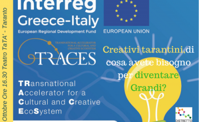 CREATIVI, DI COSA AVETE BISOGNO PER DIVENTARE GRANDI?” CONTINUA IL TOUR DEL PROGETTO TRACES NELLE PROVINCE PUGLIESI Seconda tappa: Giov. 11.10.18 h. 16.30 Teatro TaTÀ (Via Grazia Deledda) Taranto La missione del Distretto Produttivo Puglia Creativa, partner del Progetto TRACES – TRansnational Accelerator for a Cultural and Creative EcoSystem, finanziato…