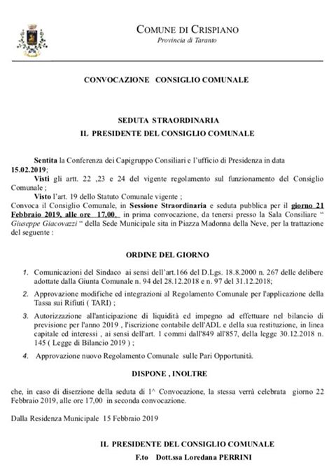 CONVOCAZIONE CONSIGLIO COMUNALE GIOVEDÌ 21 FEBBRAIO 2019 alle ore 17:00