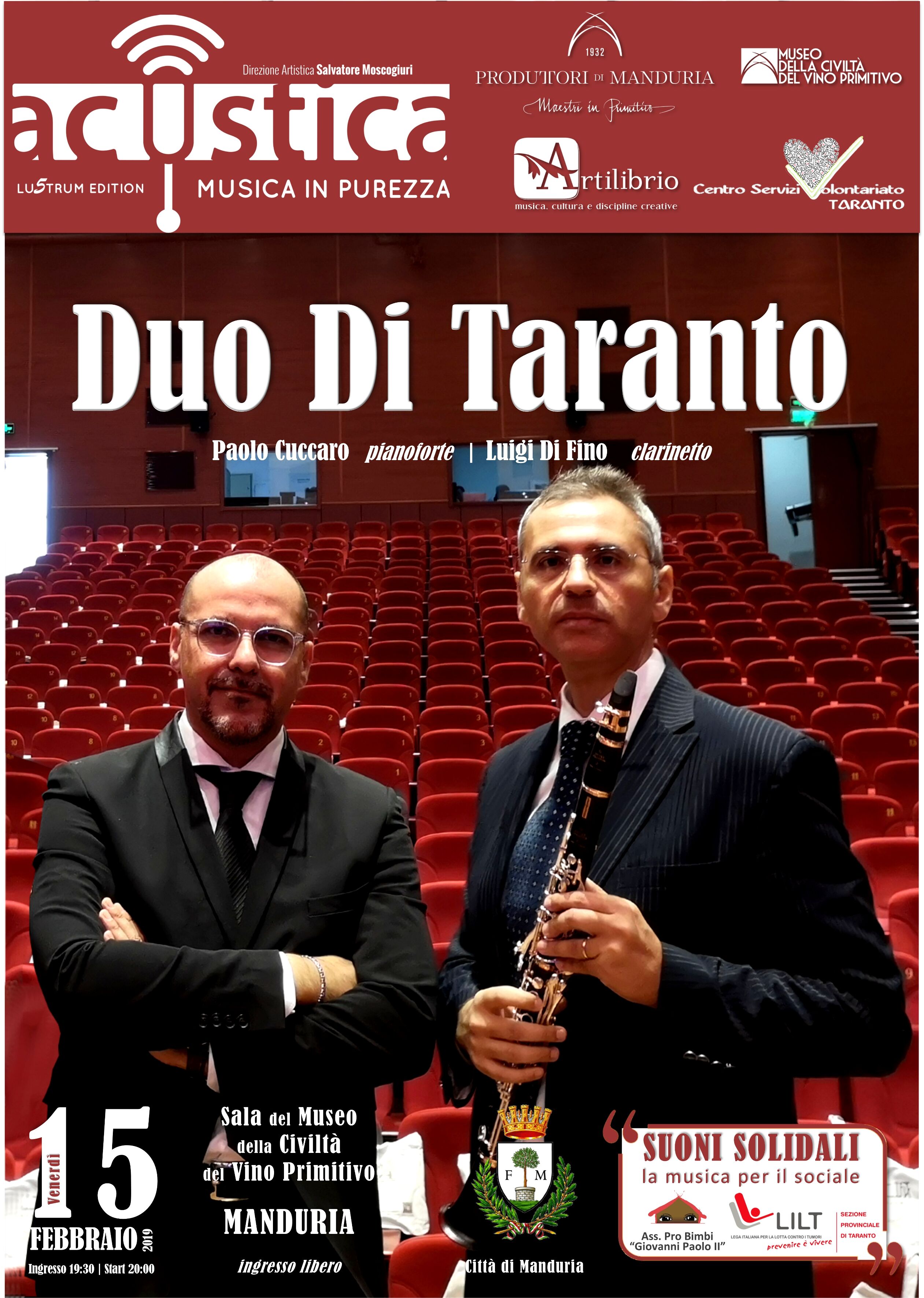 L’appuntamento è per venerdì 15 febbraio, con il Duo Di Taranto, composto da Paolo Cuccaro (pianoforte) e Lugi di Fino (clarinetto). Sul palco del Museo della Civiltà del Vino Primitivo a Manduria