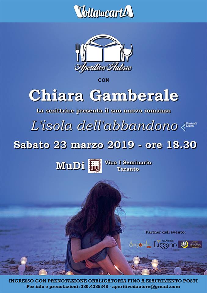 È Chiara Gamberale l’ospite del prossimo Aperitivo d’Autore che si terrà sabato 23 marzo (ore 18.30) al MuDi di Taranto. Nella suggestiva cornice dello storico palazzo in città vecchia la scrittrice romana parlerà del suo nuovo romanzo, pubblicato da Feltrinelli, “L’isola dell’abbandono”. Una storia profonda su quei pochissimi ma decisivi momenti in cui la vita prende il sopravvento, ci strappa il timone dalle mani e ci chiede un faccia a faccia con noi stessi: perché un figlio nasce, perché qualcuno muore, perché un amore comincia e un amore finisce.