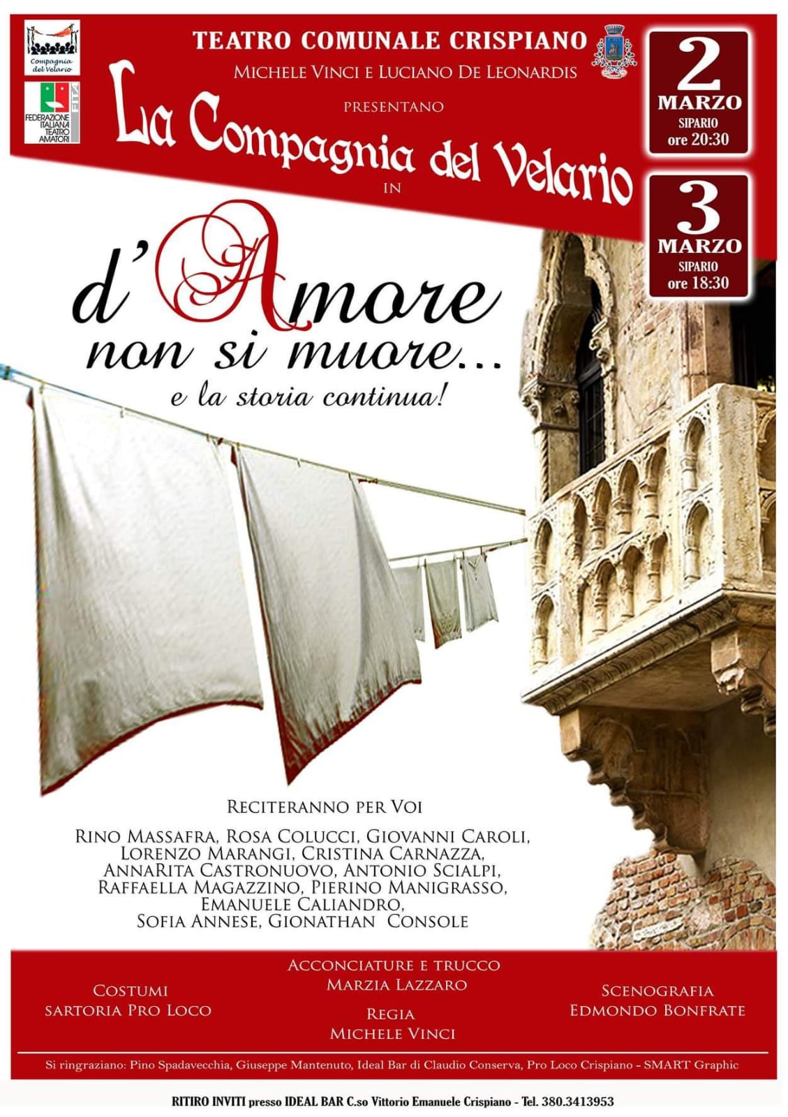 La Compagnia del Velario presenterà sabato 2 e domenica 3 marzo prossimi, al Teatro comunale di Crispiano, la nuova commedia dal titolo “D’amore non si muore… E la storia continua”.