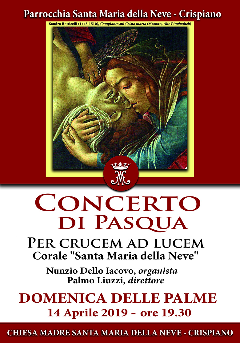 CONCERTO DI PASQUA A CRISPIANO 13 Aprile 201913 Aprile 2019comunicato CONCERTO DI PASQUA PER CRUCEM AD LUCEM Corale “Santa Maria della Neve” Nunzio Dello Iacovo, organista Palmo Liuzzi, direttore DOMENICA DELLE PALME 14 Aprile 2019 – ore 19.30