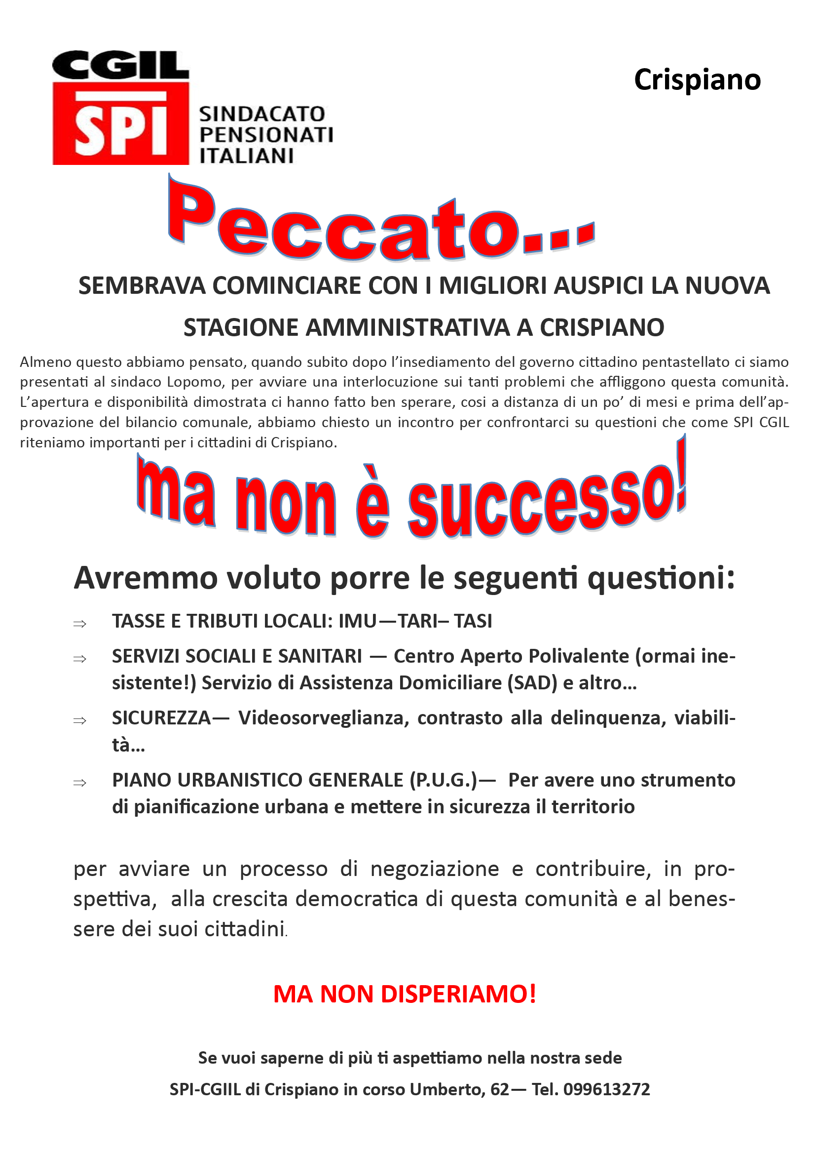 Almeno questo abbiamo pensato, quando subito dopo l’insediamento del governo cittadino pentastellato ci siamo presentati al sindaco Lopomo, per consegnargli una lettera aperta relativa al tributo Tari: la storia infinita! Ben consapevoli che non fossero certo loro i responsabili, ma per avviare una interlocuzione sui tanti problemi che affliggono questa comunità. L’apertura e disponibilità dimostrata ci hanno fatto ben sperare, cosi a distanza di un po’ di mesi e ben prima dell’approvazione del bilancio, abbiamo chiesto un incontro per confrontarci su questioni che come SPI CGIL riteniamo importanti per i cittadini di Crispiano.