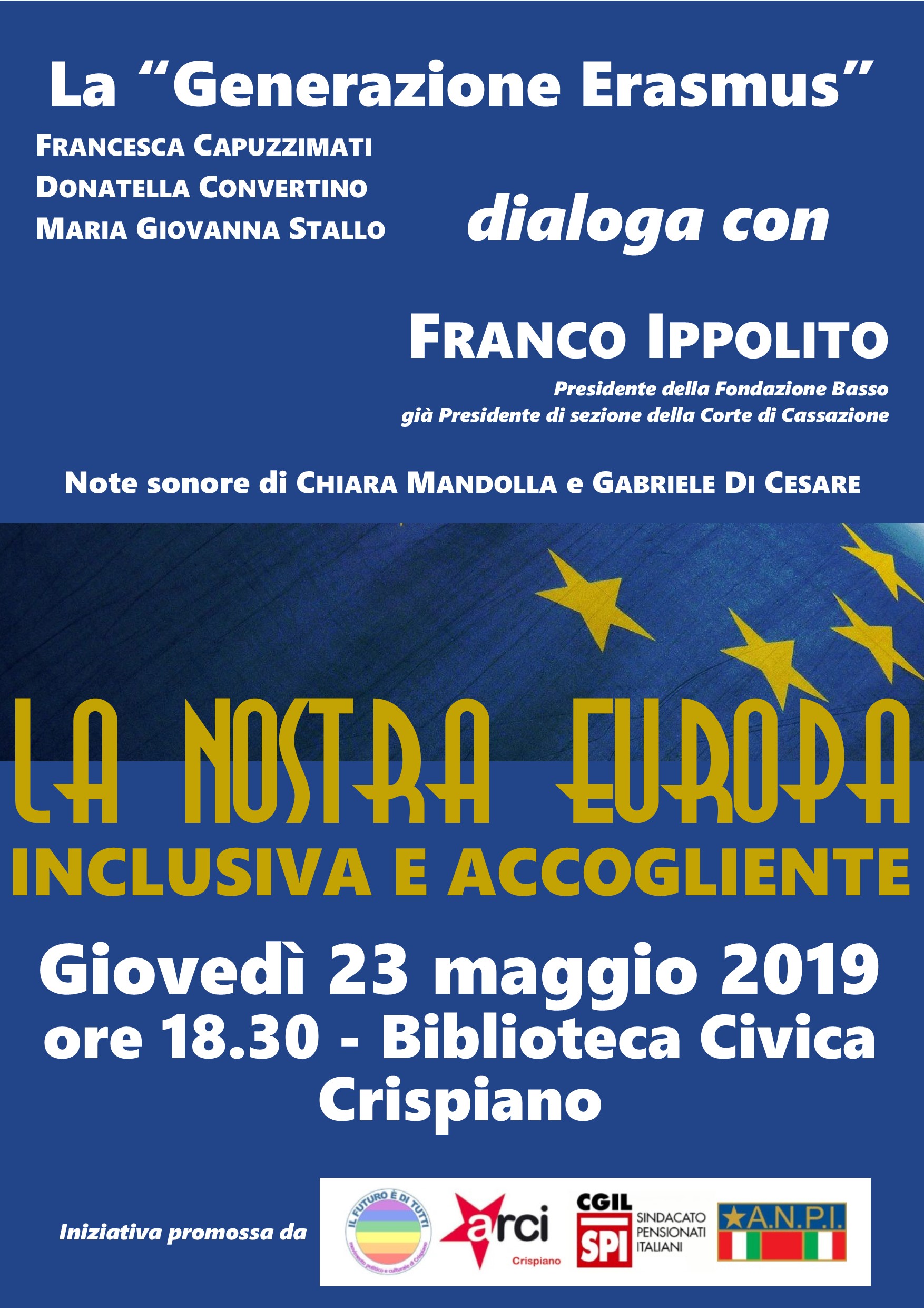 Giovedì 23 maggio alle 18.30 presso la Biblioteca Civica “Carlo Natale” di Crispiano si terrà un dibattito sull’Europa. Gli interlocutori principale saranno alcuni giovani, definiti dagli organizzatori la “Generazione Erasmus”, che dialogheranno con Franco Ippolito, Presidente della Fondazione Basso, già Presidente di sezione della Corte di Cassazione.