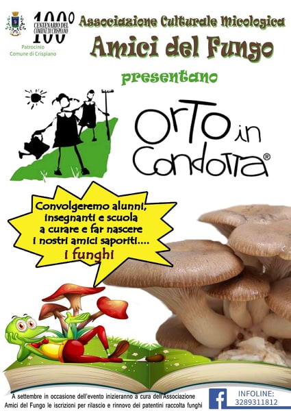 Convolgeremo alunni,insegnanti e scuole a curare e a far nascere i nostri amici saporiti…. i funghi. A settembre in occasione dell’evento inizieremo a cura dell’associazione Amici del Fungo le iscrizioni per il rilascio e il rinnovo dei patentini raccolta funghi.