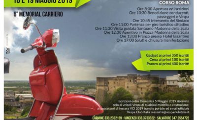 È con grande piacere ed orgoglio che annunciamo il Primo Raduno Nazionale del nostro VESPA CLUB nella città di Massafra.L’evento si terrà nei giorni 18 e 19 maggio con partenza da p.zza Vittorio Emanuele e vedrà la partecipazione di migliaia di motocicli targati VESPA sfrecciare per le vie del paese…