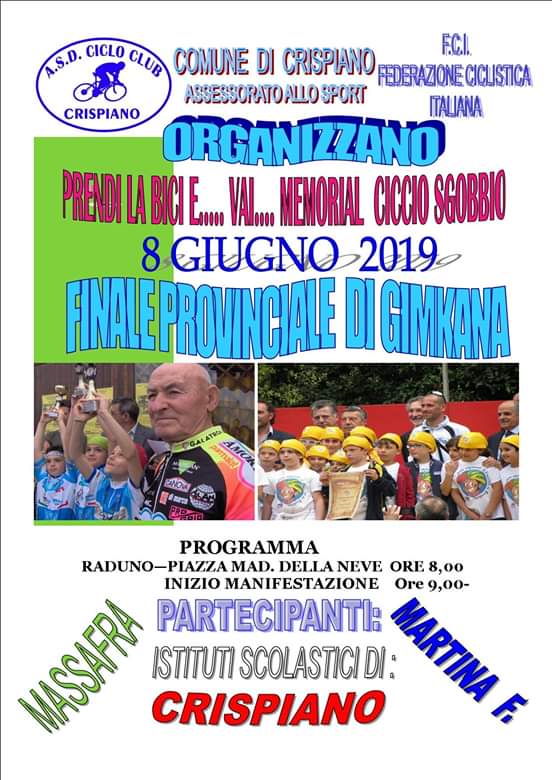 PRENDI LA BICI E……..VAI 9 Maggio 20199 Maggio 2019sport Appuntamento giorno 8 Giugno 2019 in piazza Madonna della Neve. Finale Provinciale di Gimkana con i ragazzi delle scuole elementari di Martina F, Massafra e Crispiano organizzata dal Ciclo Club Crispiano.
