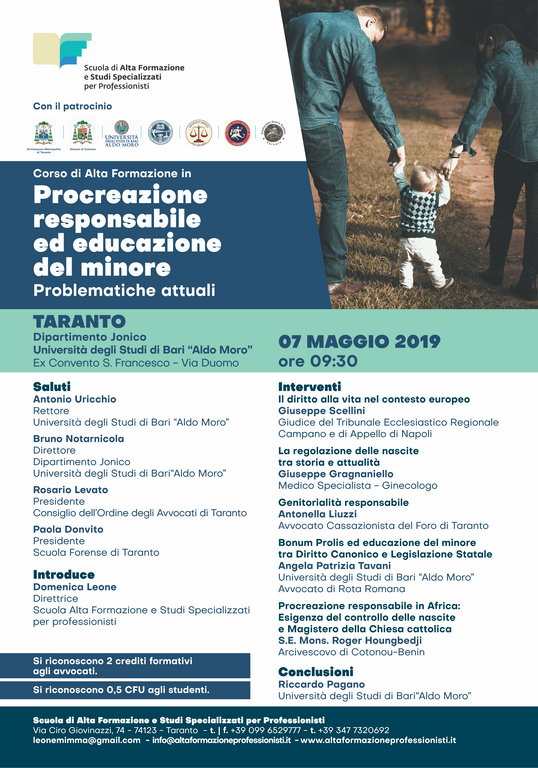 Si terrà giorno 7 maggio 2019 a partire dalle ore 09,30, nella sede di via Duomo – Taranto del Dipartimento ionico Università degli Studi di Bari “Aldo Moro”, un corso di alta formazione in Procreazione responsabile ed educazione del minore. Problematiche attuali. Porteranno i saluti istituzionali il M.co Rettore prof. Antonio Uricchio, il Direttore del Dipartimento Ionico prof. Bruno Notarnicola, il Presidente dell’Ordine degli Avvocati Avv. Rosario Levato, e il Presidente della Scuola Forense Avv. Paola Donvito. Introdurrà il Direttore della Scuola di Alta Formazione e Studi Specializzati per Professionisti Avv. Domenica Leone.