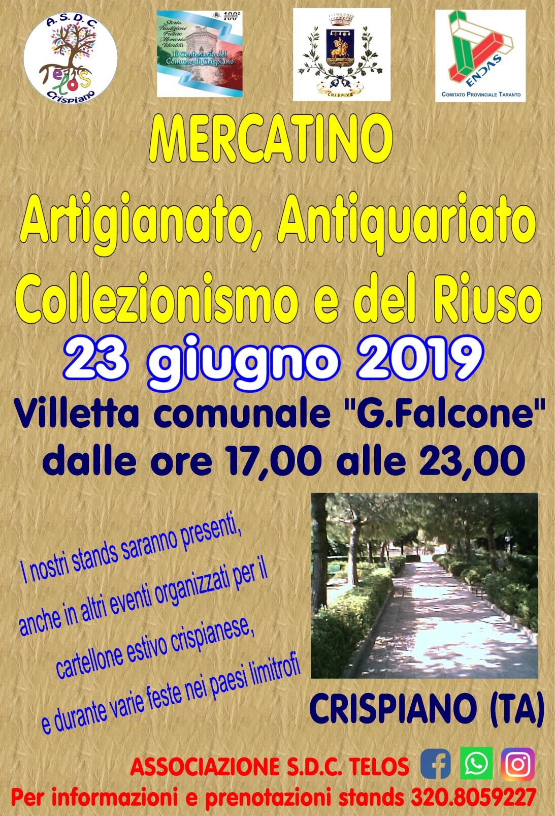 DOMENICA 23 giugno, a partire dalle ore 17,00 presso la villetta comunale G.Falcone” saranno presenti stand di artigianato, antiquariato, collezionismo e del riuso.