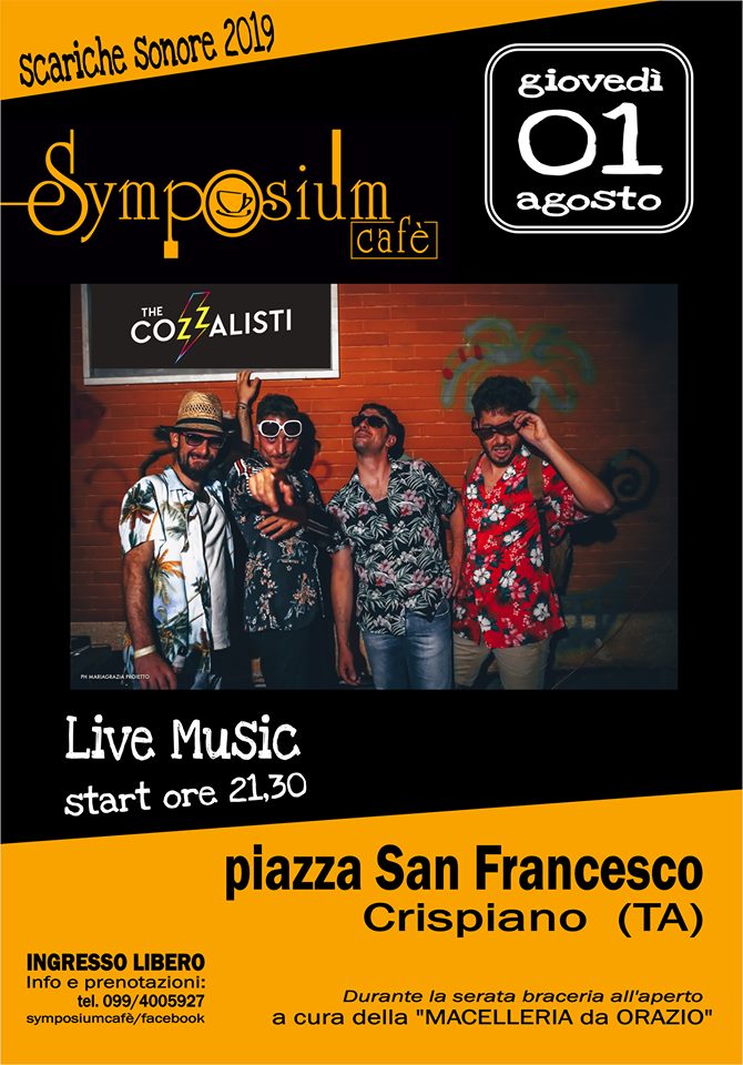 Giovedì 1 agosto va in scena a Crispiano il live dei The Cozzalisti che riporterà il pubblico negli anni ’90. È definito trash… inante lo show della band della provincia di Bari che propone una elettrizante scaletta suonata e mixata dal vivo, con le migliori hit di quel decennio. Il concerto fa parte della sesta edizione della rassegna musicale Scariche Sonore, organizzata dall’associazione Symposium Arte. Come sempre, l’appuntamento è in piazza San Francesco alle 22. Per info e prenotazioni tavoli: 099.4005927.