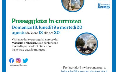 Venerdi 16 agosto dalle 18 alle 20 è prevista una visita guidata presso la MASSERIA QUIS UT DEUS, risalente al 1710, con possibilità di visionare la cappella con gli affreschi ancora intatti e il giardino delle pietre. A seguire si terrà un animatissimo LABORATORIO DI TRASFORMAZIONE DEI CEREALI CON DEGUSTAZIONE. Inoltre,…