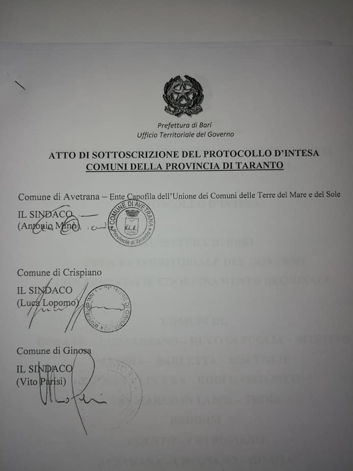 Crispiano, di Ginosa, e con il Comune di Avetrana in qualita di Ente capofila dell’Unione dei 7