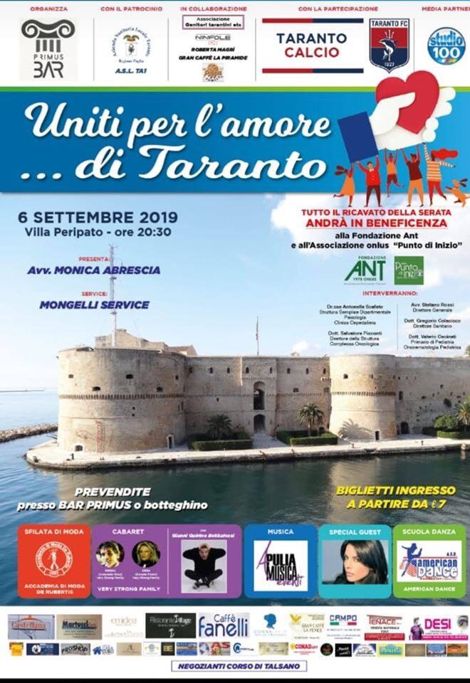 Una serata dedicata a Taranto e alla solidarietà. Sul palco del teatro della Villa Peripato si alterneranno musica, danza e cabaret. Tra gli ospiti anche la cantante Mietta e la Very Strong Family. Chiuderà la serata un intervento dedicato a Nadia Toffa. L’intero ricavato della serata sarà devoluto ala Fondazione Ant e all’associazione Punto d’inizio Onlus per la realizzazione di una stanza presso l’ospedale Moscati dedicata alla estetica oncologica. Inizio dello spettacolo: ore 20,30. Apertura botteghino: ore 19,30. Un’occasione per stare insieme, divertirci e contribuire alla realizzazione di un importantissimo progetto. Grazie.