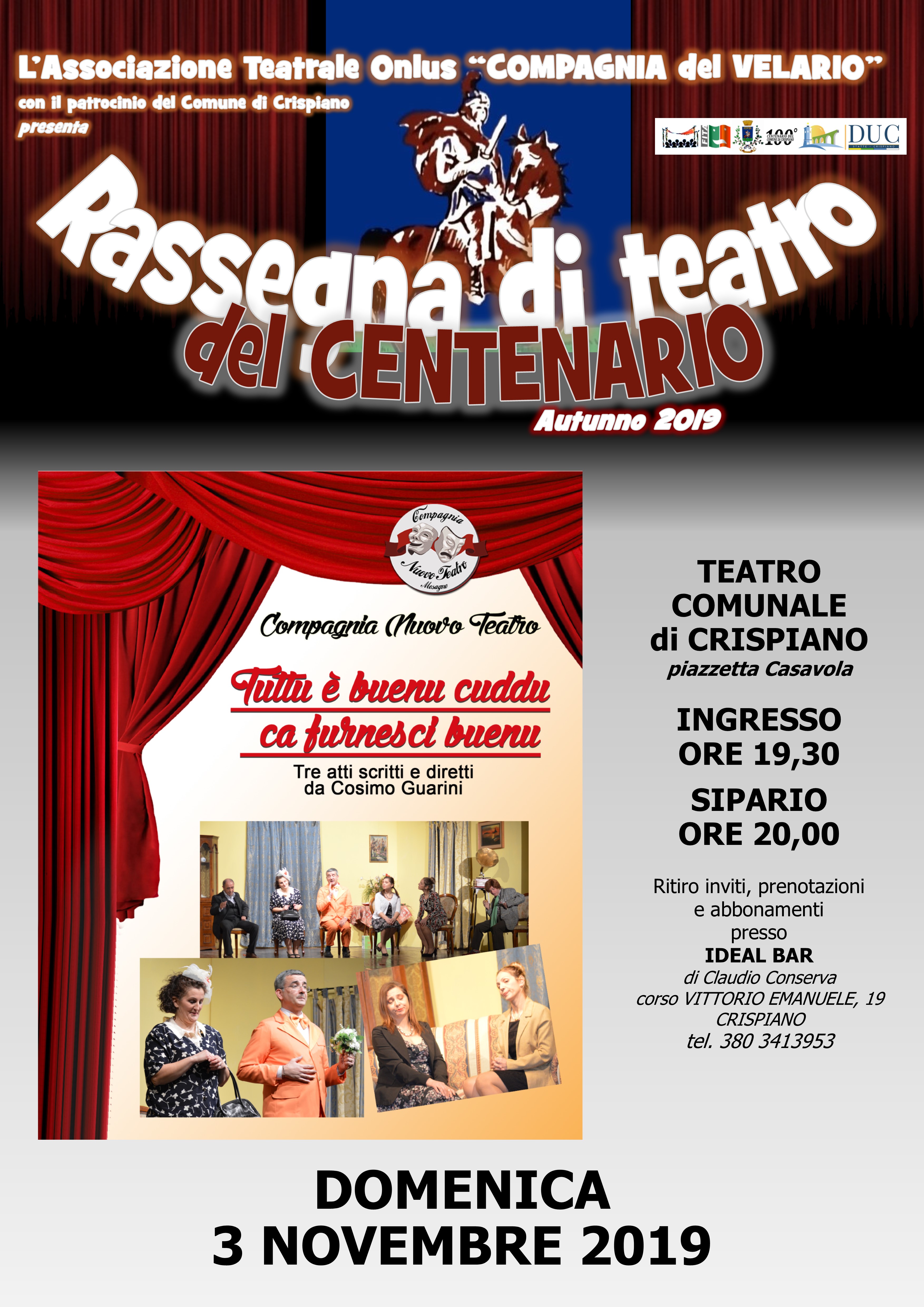 “Tuttu è buenu cuddu ca furnesci bueno” è il titolo della commedia che verrà rappresentata domenica 3 novembre dalla Compagnia Nuovo Teatro di Mesagne. Si tratta di tre atti scritti e diretti da Cosimo Guarini.