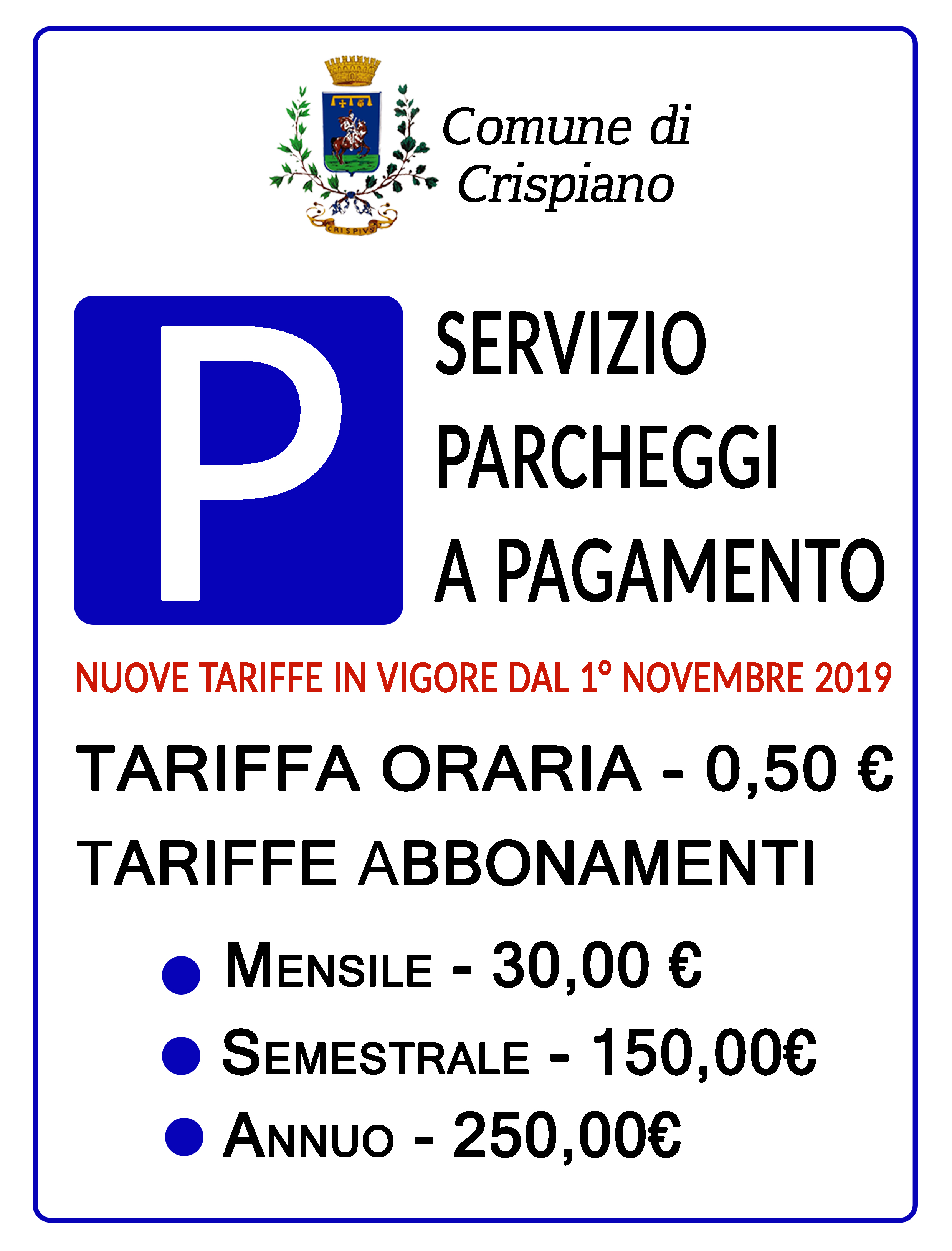 - Tagliando unico di euro 0,50 per ora di sosta