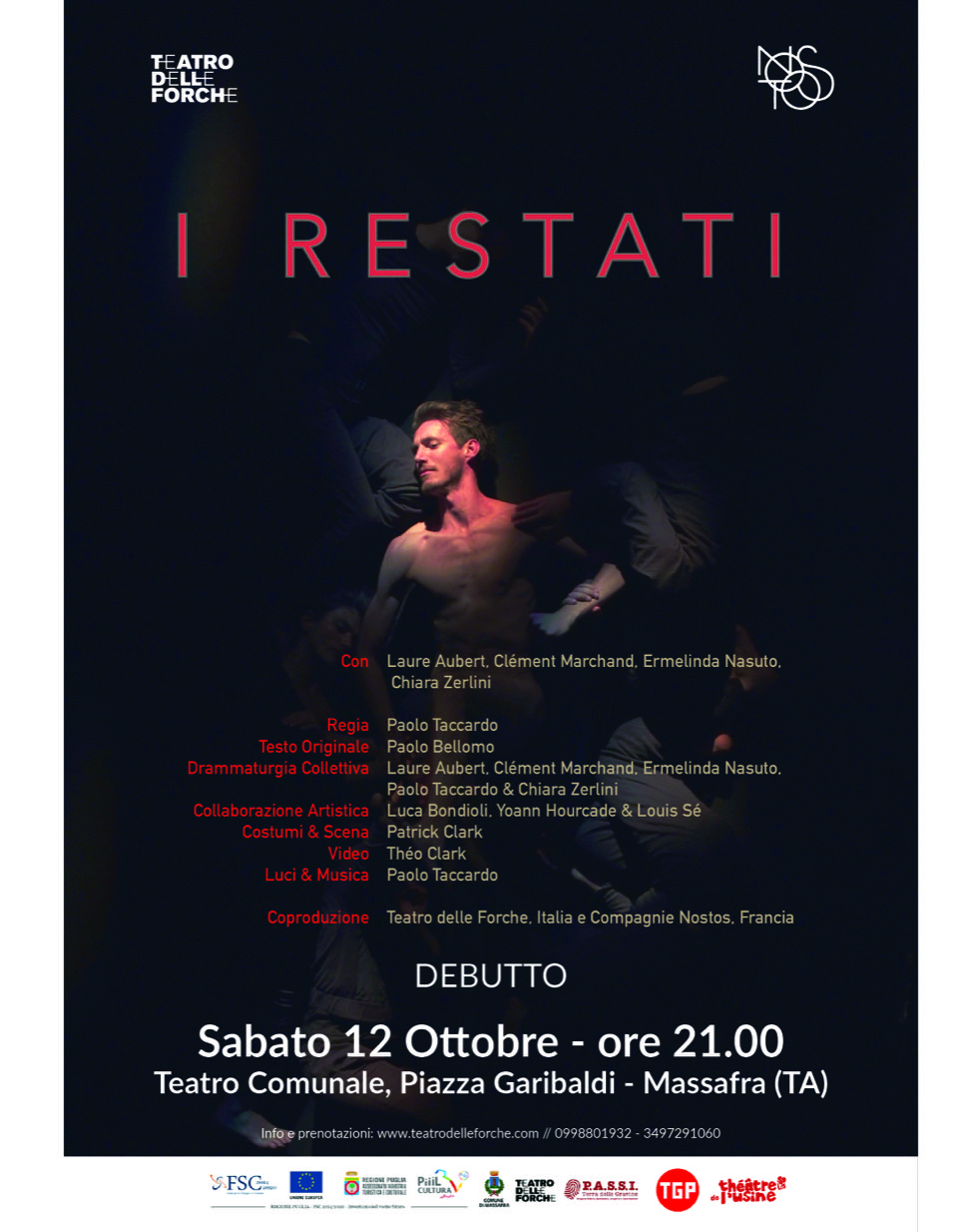 “I Restati” rientra tra le produzioni 2019 di “P.A.S.S.I.” (Progetto, Arte, Spettacolo, Scoperta e Innovazione nella Terra delle Gravine) – progetto artistico triennale a cura del Teatro delle Forche, in ordine all’avviso pubblico per iniziative progettuali riguardanti lo spettacolo dal vivo e le residenze artistiche (Patto per la Puglia – FSC 2014/2020 – Area di intervento “Turismo, cultura e valorizzazione delle risorse naturali”) – ed è frutto di un percorso di collaborazione tra il Teatro delle Forche e la compagnia Nostos originatosi nel 2016 con il progetto di residenza internazionale “Convocazioni”, proseguito e concretizzatosi nel 2017 con un accordo di coproduzione e due tappe di lavoro in Francia nel 2018 e 2019, in collaborazione con il Théâtre Gérard-Philipe – Centre Dramatique National de Saint Denis e con il Théâtre de l’Usine – Éragny-sur-Oise.