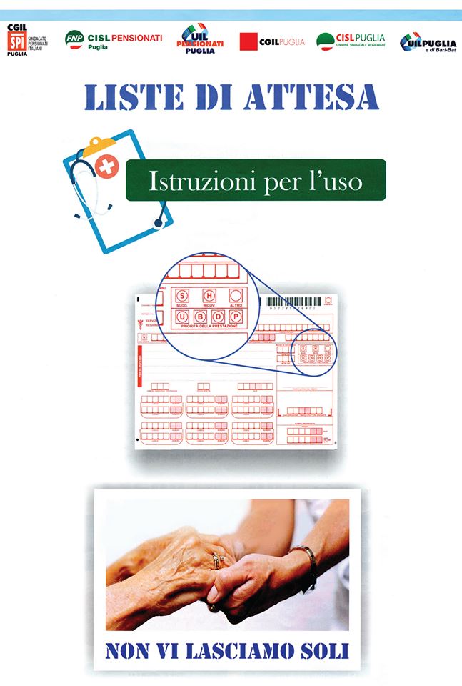 Le interminabili liste d’attesa, lesive del diritto alla salute costituzionalmente garantito, rappresentano un problema molto sentito dai cittadini e in particolare dai pensionati. Per questa ragione i pensionati della Lega SPI-CGIL di Crispiano si sono dati appuntamento nei giorni 15 e 24 ottobre 2019davanti al Distretto Socio-Sanitario per distribuire un volantino informativo con le “Istruzioni per l’uso” contro le lungaggini delle liste d’attesa. Nel volantino sono precisati i diritti degli assistiti e le modalità su come esercitarli, a partire dalla prescrizione del proprio medico curante, alla prenotazione presso i CUP, fino alla presa in carico da parte del Servizio Sanitario. Come sindacato dei pensionati non vogliamo lasciare sola la componente più fragile della società e più esposta al rischio di perdita della salute come gli anziani. La sanità, così come si va sempre più configurando, rischia di diventare un lusso a cui può accedere solo chi è nelle condizioni di pagare il servizio e l’assistenza, tagliando fuori un numero crescente di cittadini che, sempre di più,rinunciano a curarsi. Conoscere i propri diritti e le modalità per esercitarli è, pertanto, di fondamentale importanza. Per segnalare eventuali situazioni di non conformità ai criteri adottatati sia a livello nazionale che locale, il cittadino potrà rivolgersi direttamente all’URP (Ufficio Relazioni con il Pubblico) dell’ASL di Taranto, telefonando alN. Verde 800529657 o ai seguenti numeritel: 099 4585938 / 990 / 991 / 935 / 982 oppure scrivendo a questi indirizzi mail: urp@asl.taranto.it, urp.asl.taranto@pec.rupar.puglia.it. Per ulteriori informazioni il cittadino potrà recarsi presso la nostra sede.