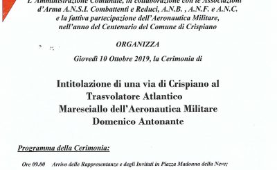 L’Amministrazione Comunale, in collaborazione con le Associazioni d’Arma Combattenti e Reduci, A.N.B. , A.N.F. e A.N.C. e la fattiva partecipazione dell’Aeronautica Militare, nell’anno del Centenario del Comune di Crispiano Giovedì 10 Ottobre 2019, la Cerimonia di intitolazione di una via di Crispiano al Trasvolatore Atlantico Maresciallo dell’Aeronautica militare Domenico Antonante.
