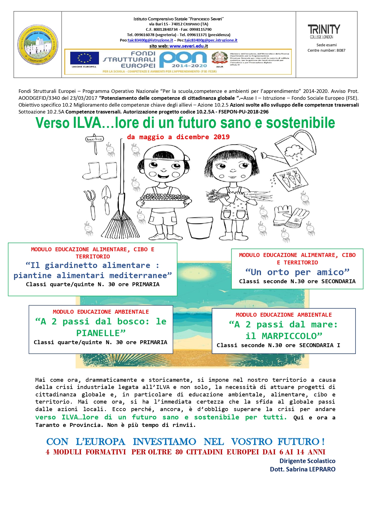 In tale direzione si colloca il riavvio delle attività formative del PON “Verso ILVA…lore di un futuro sano e sostenibile” sui temi della educazione alimentare e ambientale destinati a circa 90 alunni della scuola primaria “Giovanni XXII” e secondaria di primo grado ”F. Severi”.