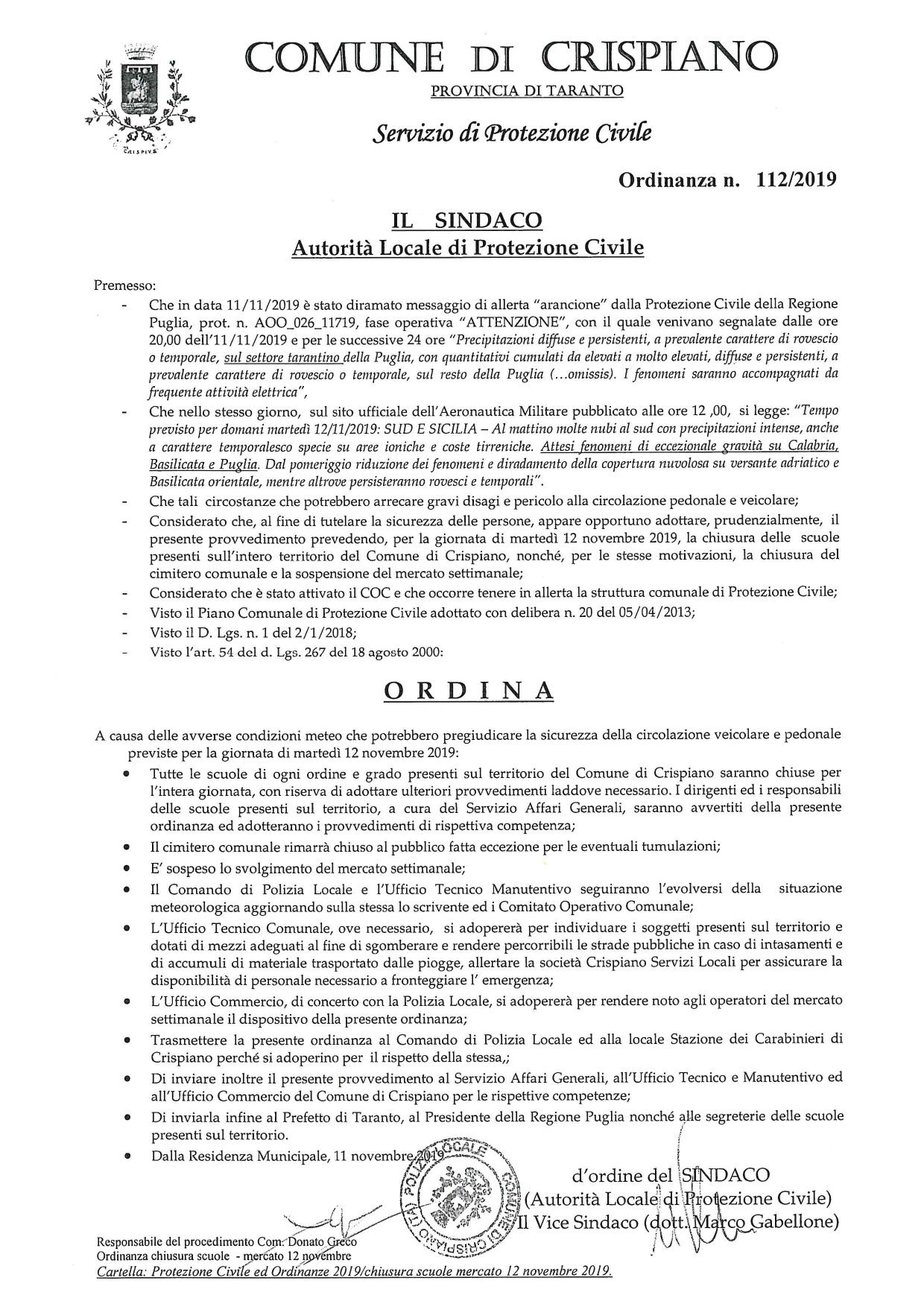 Premesso: – Che in data 11/11 /2019 è stato diramato messaggio di allerta “arancione” dalla Protezione Civile della Regione Puglia, prot. n. A00326_11719, fase operativa “ATTENZIONE”, con il quale venivano segnalate dalle ore 20,00 dell’11 /11 /2019 e per le successive 24 ore “Precipitazioni diffuse e persistenti, a prevalente carattere di rovescio o temporale, sul settore tarantino della Puglia, con quantitativi cumulati da elevati a molto elevati, diffuse e persistenti, a prevalente carattere di rovescio o temporale, sul resto della Puglia (…omissis). I fenomeni saranno accompagnati da frequente attività elettrica”, Che nello stesso giorno, sul sito ufficiale dell’Aeronautica Militare pubblicato alle ore 12 ,00, si legge: “Tempo previsto per domani martedì 12/11/2019: SUD E SICILIA — Al mattino molte nubi al sud con precipitazioni intense, anche a carattere temporalesco specie su aree ioniche e coste tirreniche. Attesi fenomeni di eccezionale gravità su Calabria,  Basilicata e Puglia. Dal pomeriggio riduzione dei fenomeni e diradamento della copertura nuvolosa su versante adriatico e Basilicata orientale, mentre altrove persisteranno rovesci e temporali”. Che tali circostanze che potrebbero arrecare gravi disagi e pericolo alla circolazione pedonale e veicolare; – Considerato che, al fine di tutelare la sicurezza delle persone, appare opportuno adottare, prudenzialmente, il presente provvedimento prevedendo, per la giornata di martedì 12 novembre 2019, la chiusura delle scuole presenti sull’intero territorio del Comune di Crispiano, nonché, per le stesse motivazioni, la chiusura del cimitero comunale e la sospensione del mercato settimanale; Considerato che è stato attivato il COC e che occorre tenere in allerta la struttura comunale di Protezione Civile; – Visto il Piano Comunale di Protezione Civile adottato con delibera n. 20 del 05/04/2013; – Visto il D. Lgs. n. 1 del 2/1/2018; – Visto l’art. 54 del d. Lgs. 267 del 18 agosto 2000: