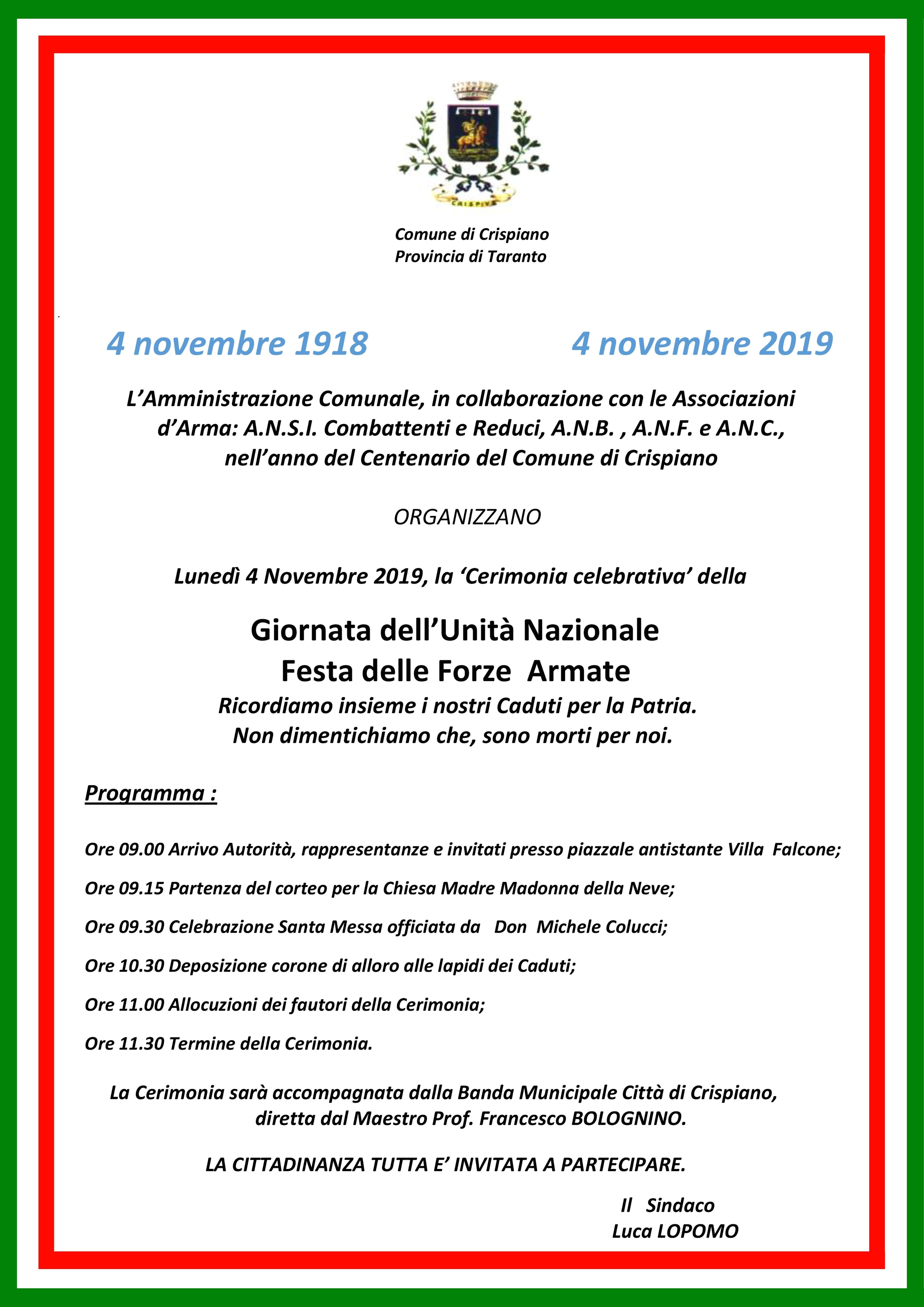 Lunedì 4 Novembre 2019, la ‘Cerimonia celebrativa’ della