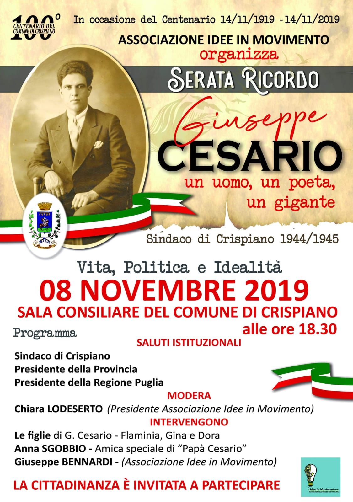In occasione dei festeggiamenti per il centenario dell’Autonomia di Crispiano l’ associazione “IDEE IN MOVIMENTO” organizza, il giorno 8 Novembre alle ore 18.30  presso la sala consiliare, una serata ricordo in memoria di Giuseppe Cesario,  Sindaco di Crispiano dal 1944 al 1945, un breve periodo che ha però segnato la vita di questo paese.