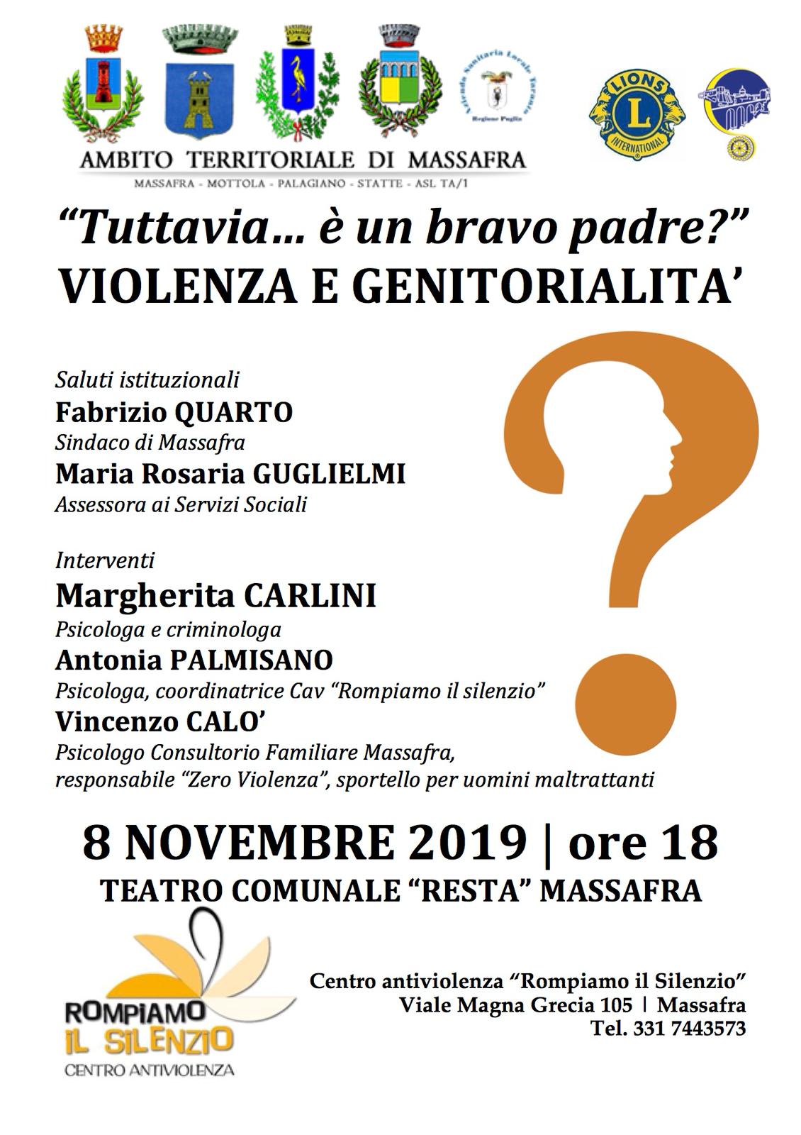 Venerdì 8 novembre, alle ore 18.00, presso il Teatro Comunale Resta di Massafra, si terrà l’incontro pubblico dal titolo “Tuttavia… E’ un buon padre? Violenza e genitorialità” con un’ospite d’eccezione: la criminologa Margherita Carlini
