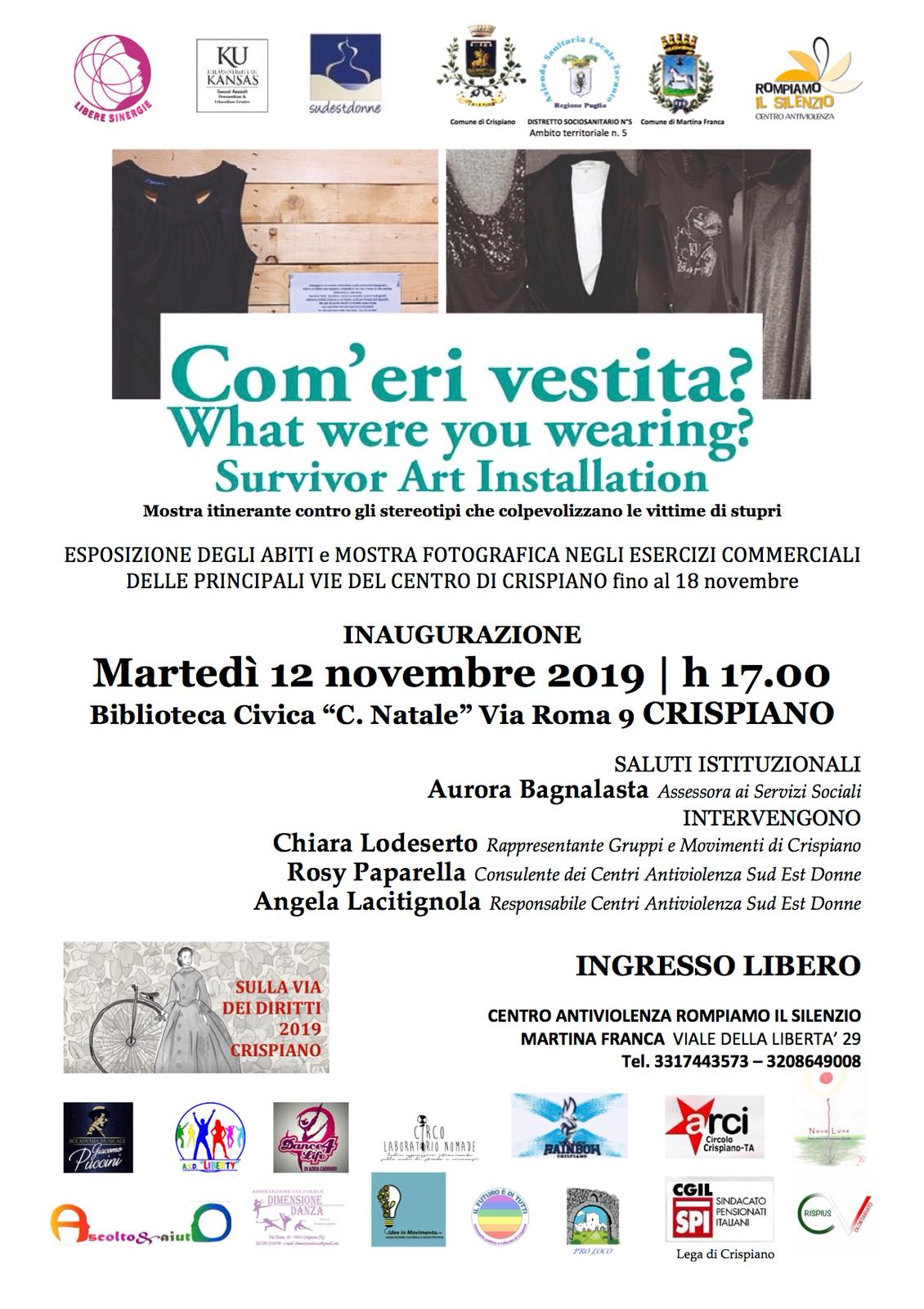Si comincia con una mostra itinerante dal titolo emblematico “Com’eri vestita? Il cui obiettivo è destrutturare gli stereotipi che colpevolizzano le donne vittime di stupro. Sarà ospitata dagli esercizi commerciali del centro cittadino ed evidenzierà in maniera plateale l’infondatezza dello stereotipo che è alla base del “te la sei cercata”. Si inaugura il 12 novembre alle ore 17 presso la Biblioteca Civica “C. Natale”.