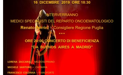 L’Associazione V.I.TA, in collaborazione con “ Qui e Ora Due Occhi belli Crispius” e CMC di Crispiano, ha organizzato per il 16 dicembre 2019 presso la Villa Maria un Concerto per beneficenza in favore del reparto OncoEmatologico Pediatrico dell’Ospedale SS. Annunziata di Taranto. Interverranno i medici specialisti del reparto pediatrico…