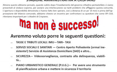 SEMBRAVA COMINCIARE CON I MIGLIORI AUSPICI LA NUOVA STAGIONE AMMINISTRATIVA A CRISPIANO! Almeno questo abbiamo pensato, quando subito dopo l’insediamento del governo cittadino pentastellato ci siamo presentati al sindaco Lopomo, per consegnargli una lettera aperta relativa al tributo Tari: la storia infinita! Ben consapevoli che non fossero certo loro i…