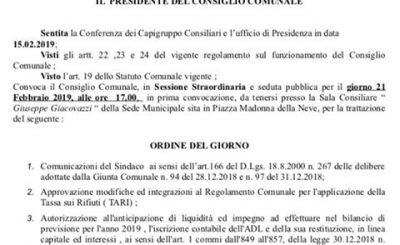 CONVOCAZIONE CONSIGLIO COMUNALE GIOVEDÌ 21 FEBBRAIO 2019 alle ore 17:00 All’ordine del giorno: Comunicazioni del sindaco ai sensi dell’art. 166 del D.Lgs. 18.8.2000 n. 267 delle delibere adottate dalla Giunta Comunale n. 94 del 28.12.2018 e n. 97 del 31.12.2018; Approvazione modifiche ed integrazioni al Regolamento Comunale per l’applicazione della…