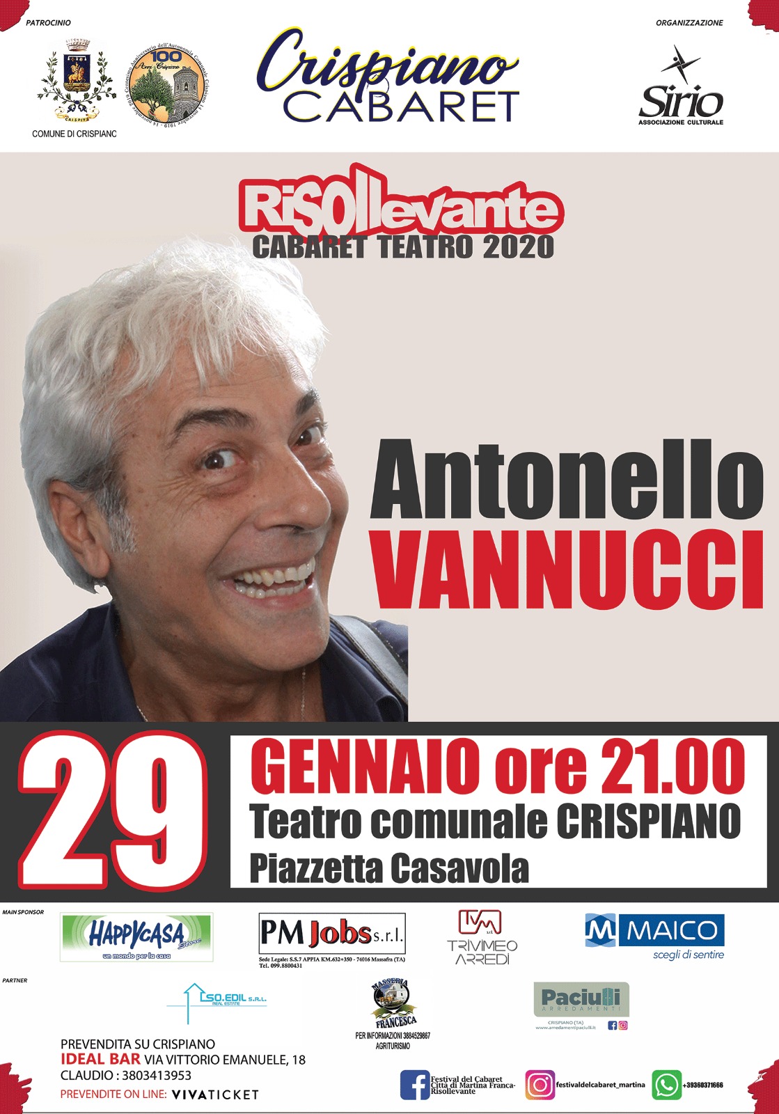 Mercoledì 29 gennaio al teatro Comunale di Crispiano (Ta) si esibirà il musicomico Antonello Vannucci, con lo spettacolo “Past the Saint past the party”, per il primo appuntamento del cartellone “Crispiano Cabaret” del “Risollevante Cabaret teatro 2020”, organizzato e diretto dall’associazione culturale Sirio, con il patrocinio del Comune jonico.