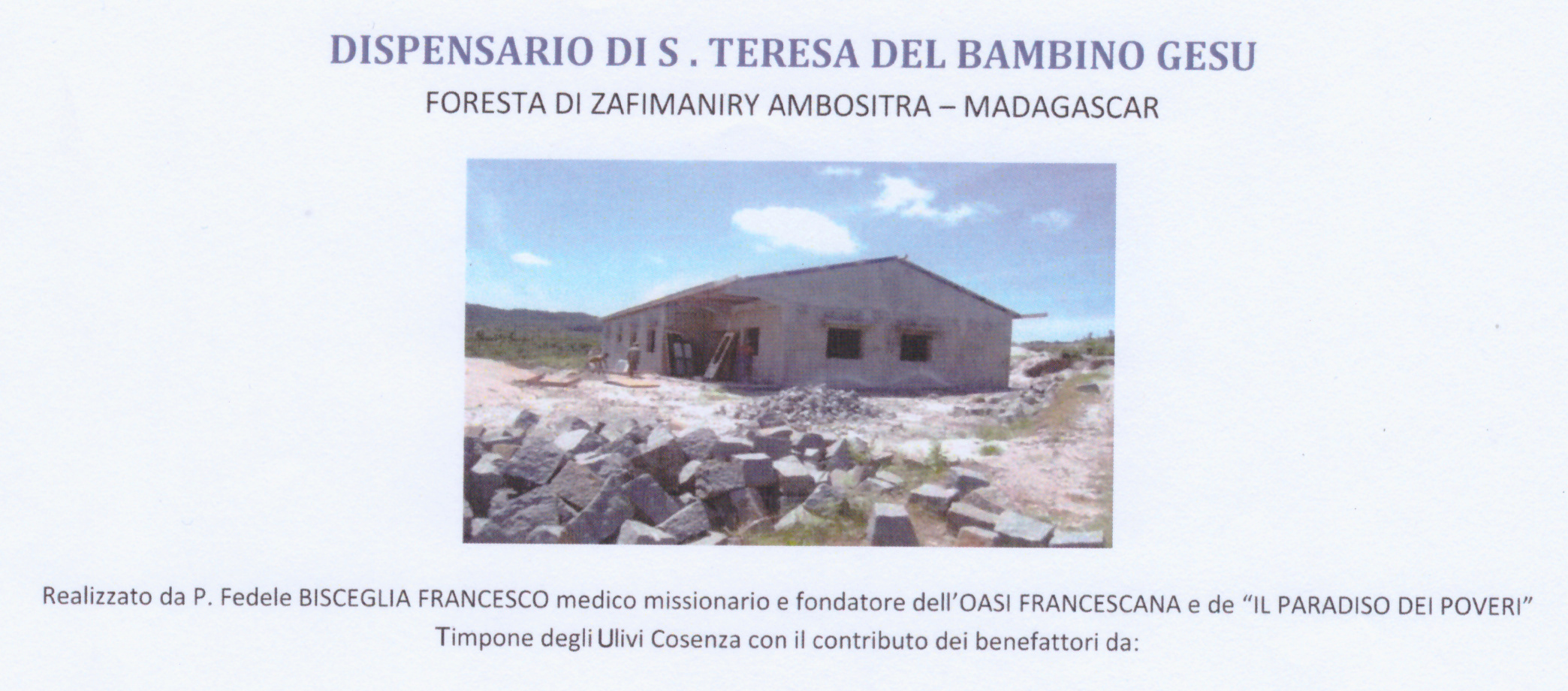 La nuova iniziativa di Padre Fedele, realizzata come associazione onlus, riguarda la costruzione, in piena foresta, di un dispensario, “Il paradiso dei poveri”, inaugurato lo scorso 28 settembre, con una cerimonia ufficiale, seguita da Radio Maria, presenti il Vescovo di Ambositra Fidelis Rakotonarivo e tutte le Autorità comunali.